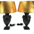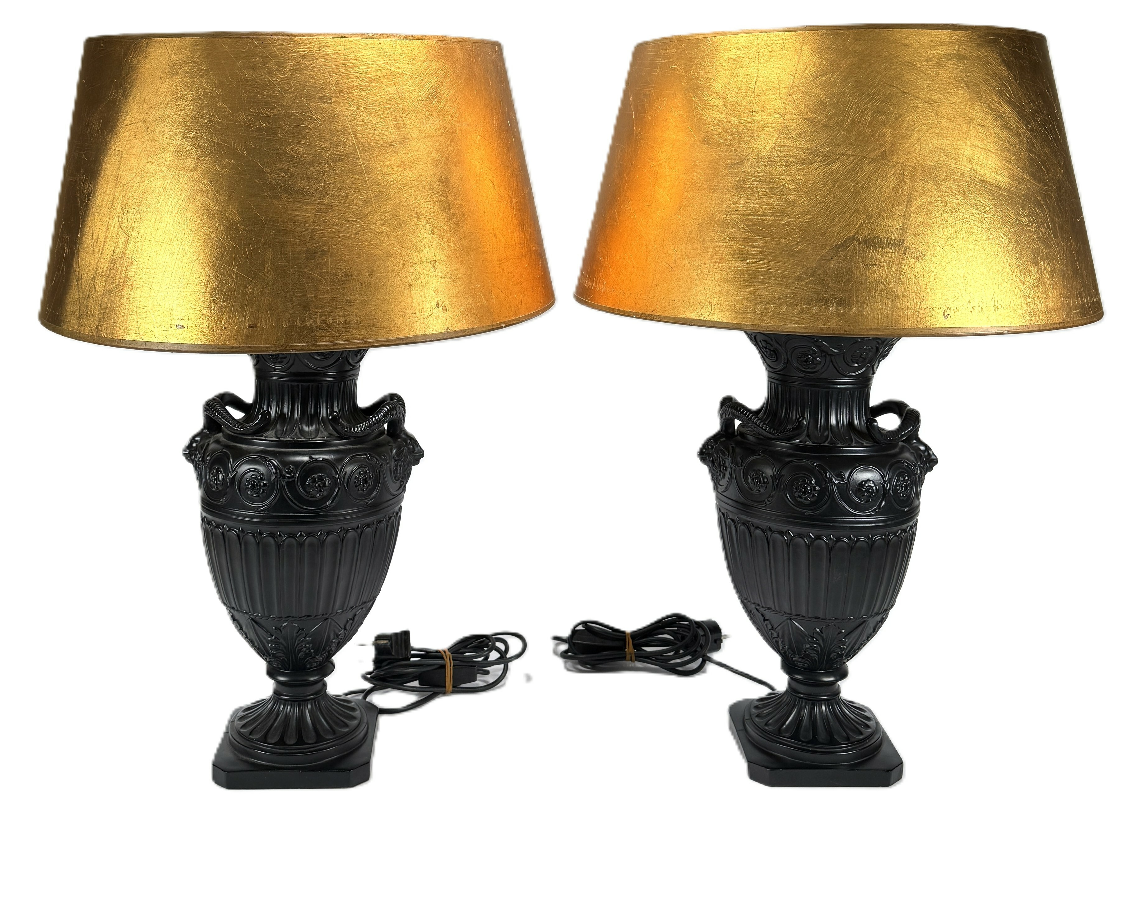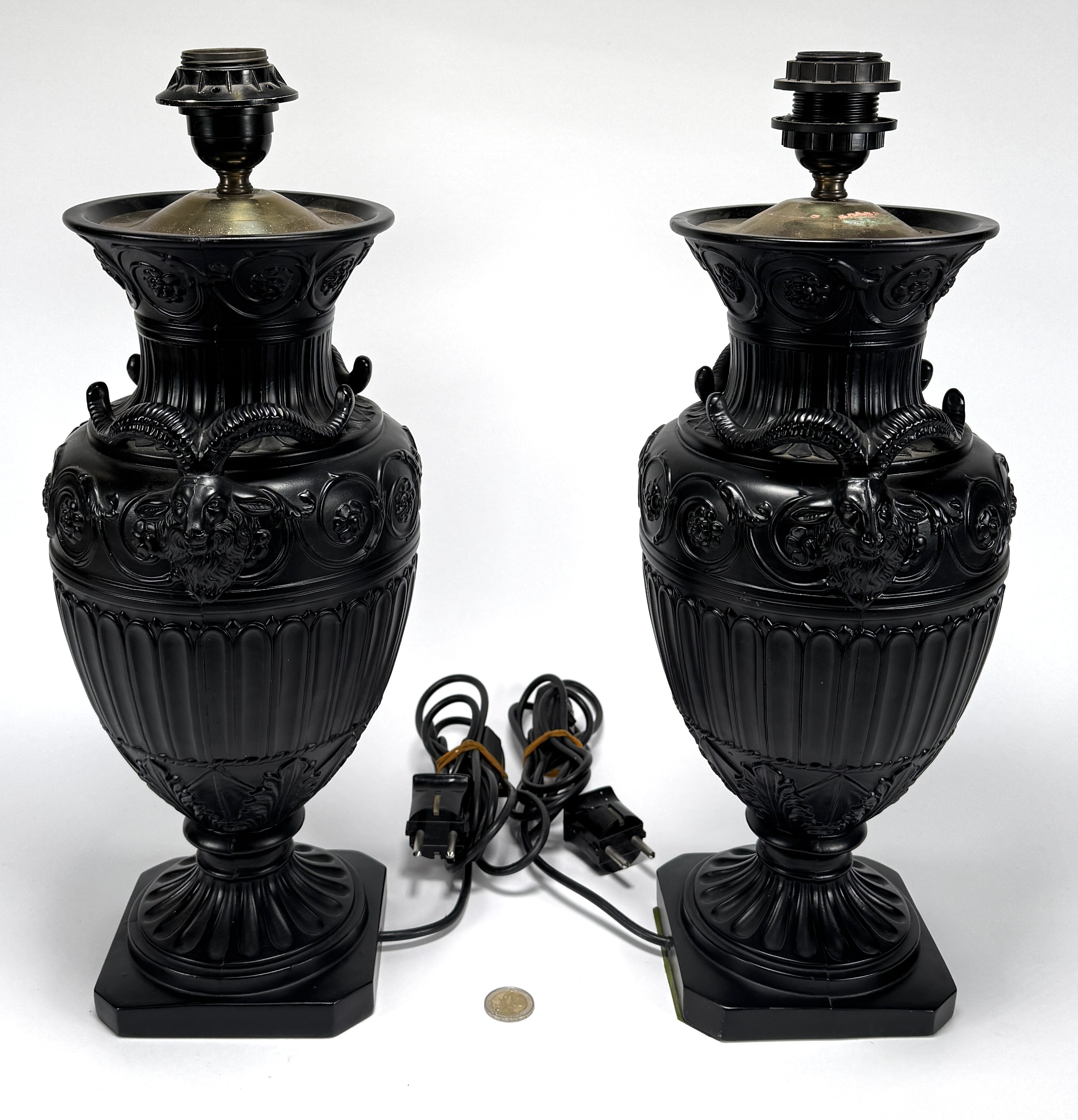 Twee tafellampen, uitgevoerd in neoclassicistische stijl met Empire invloeden, tweede helft van de 20e eeuw. De lampen hebben een basis van zwart afgewerkt composiet, gedecoreerd met ramskoppen en guirlandes in reliëf, voorzien van goudkleurige kappen. Registreer nu en bied eenvoudig online mee op deze tafellampen! |