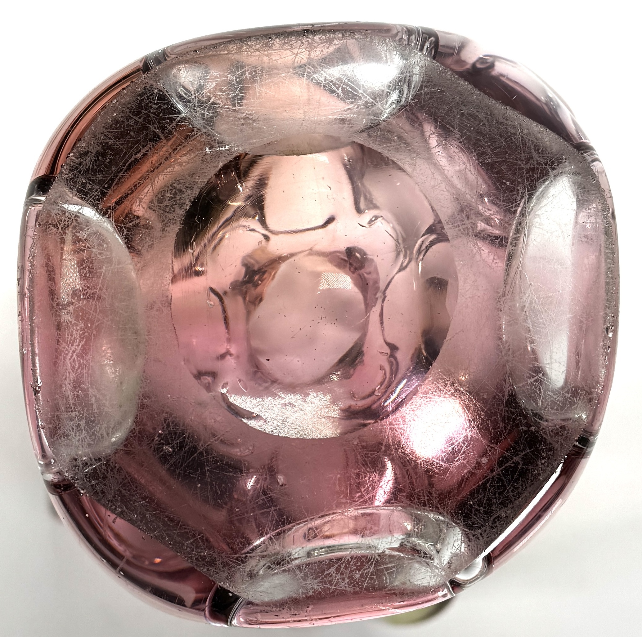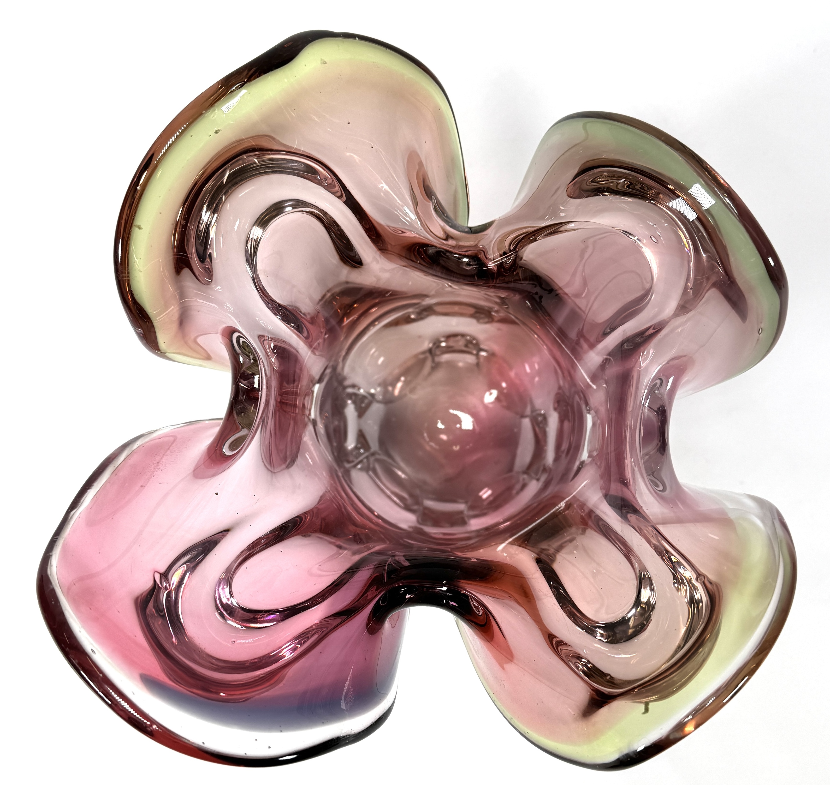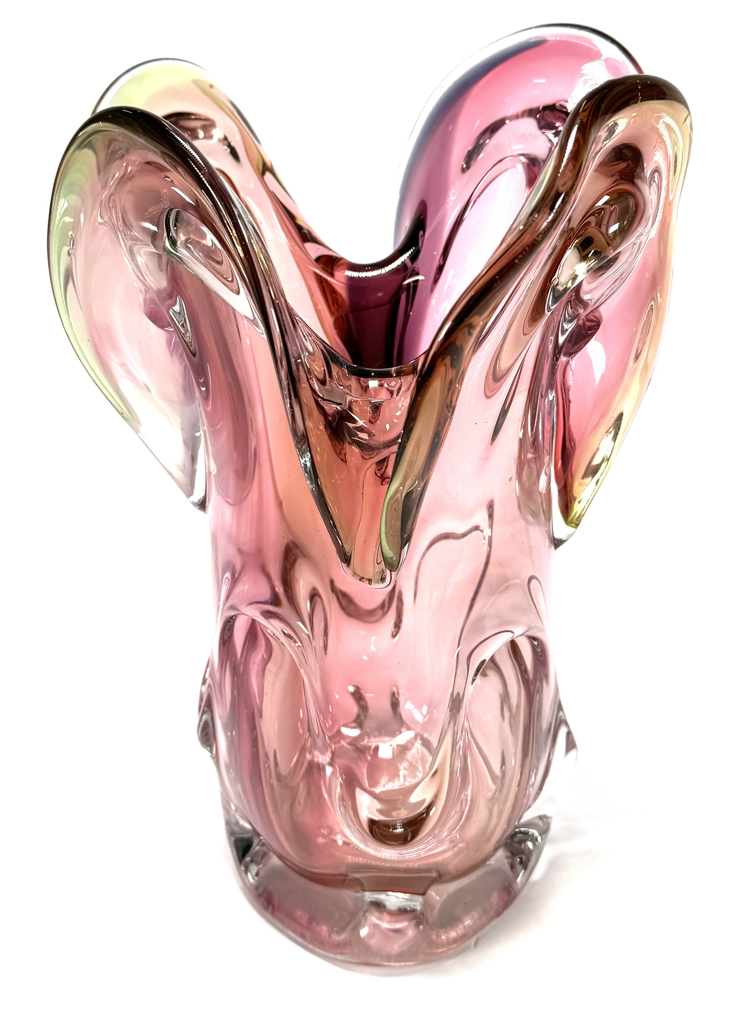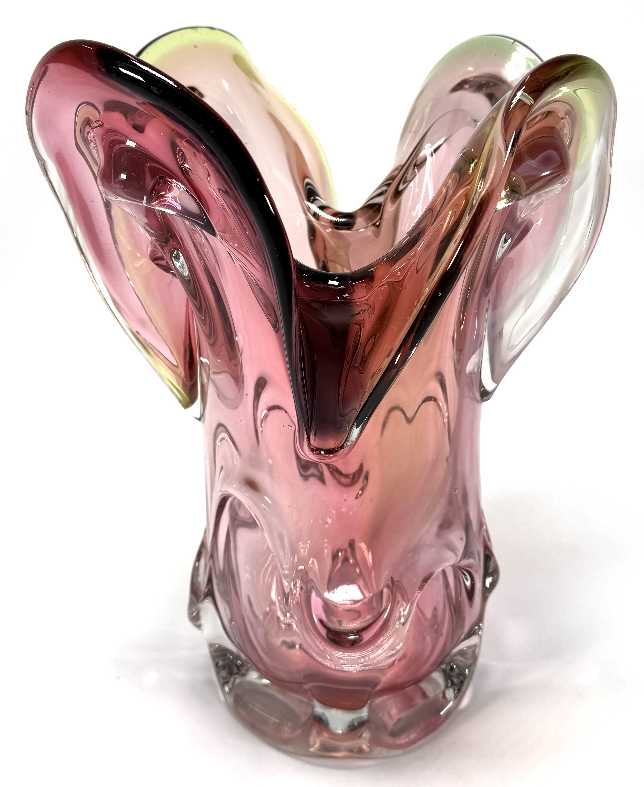 Murano glazen vaas in organische, bloemvormige stijl, uitgevoerd in dik handgevormd glas met overgangen van roze naar lichtgroen. De vaas toont een vloeiende ribstructuren en luchtbelletjes. Vervaardigd met sommerso techniek, pontilmerk aan onderzijde, tweede helft 20e eeuw. Geïnteresseerd? Bezoek onze kijkdagen op 28, 29 of 30 november van 11:00 tot 17:00 uur! |