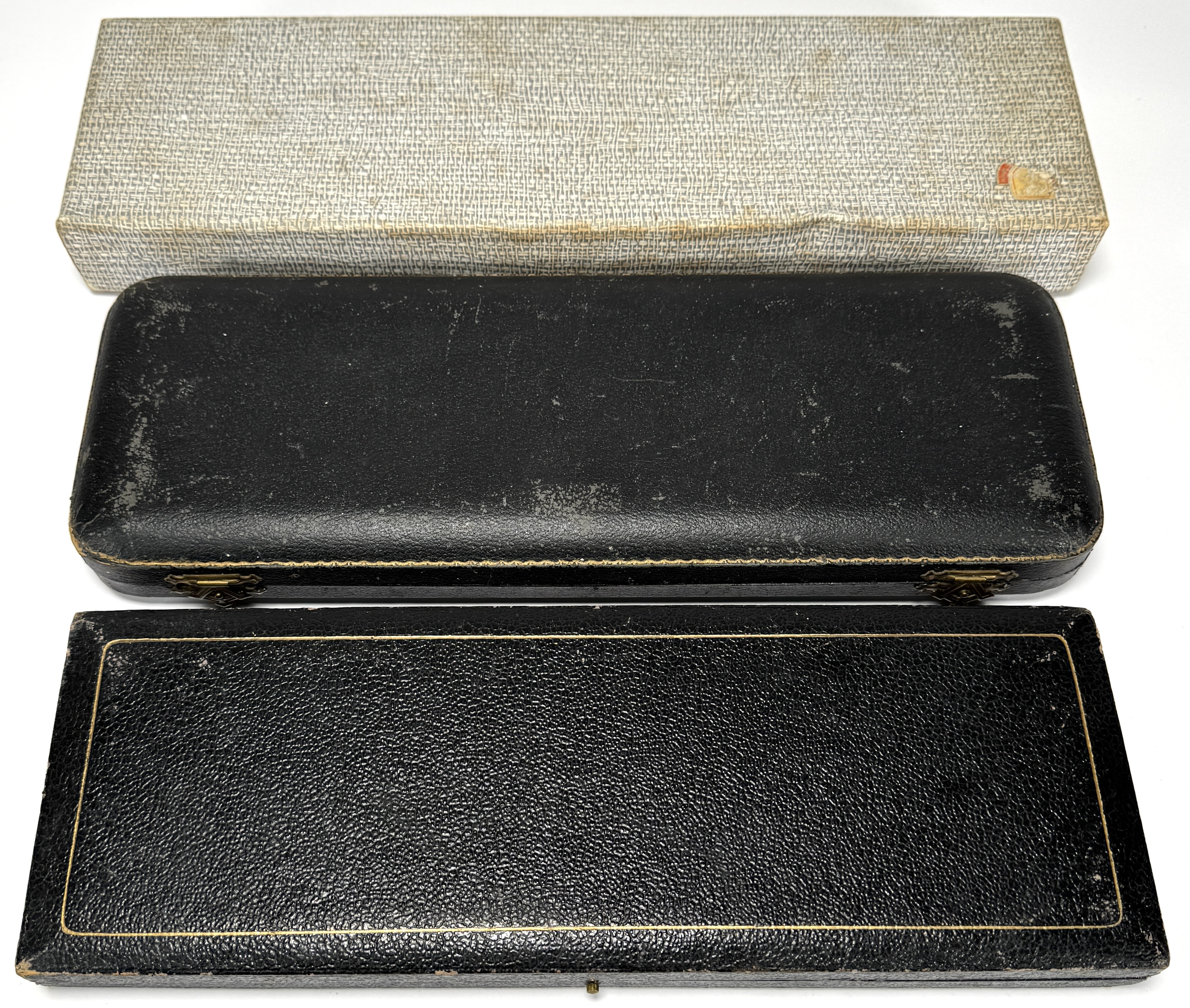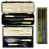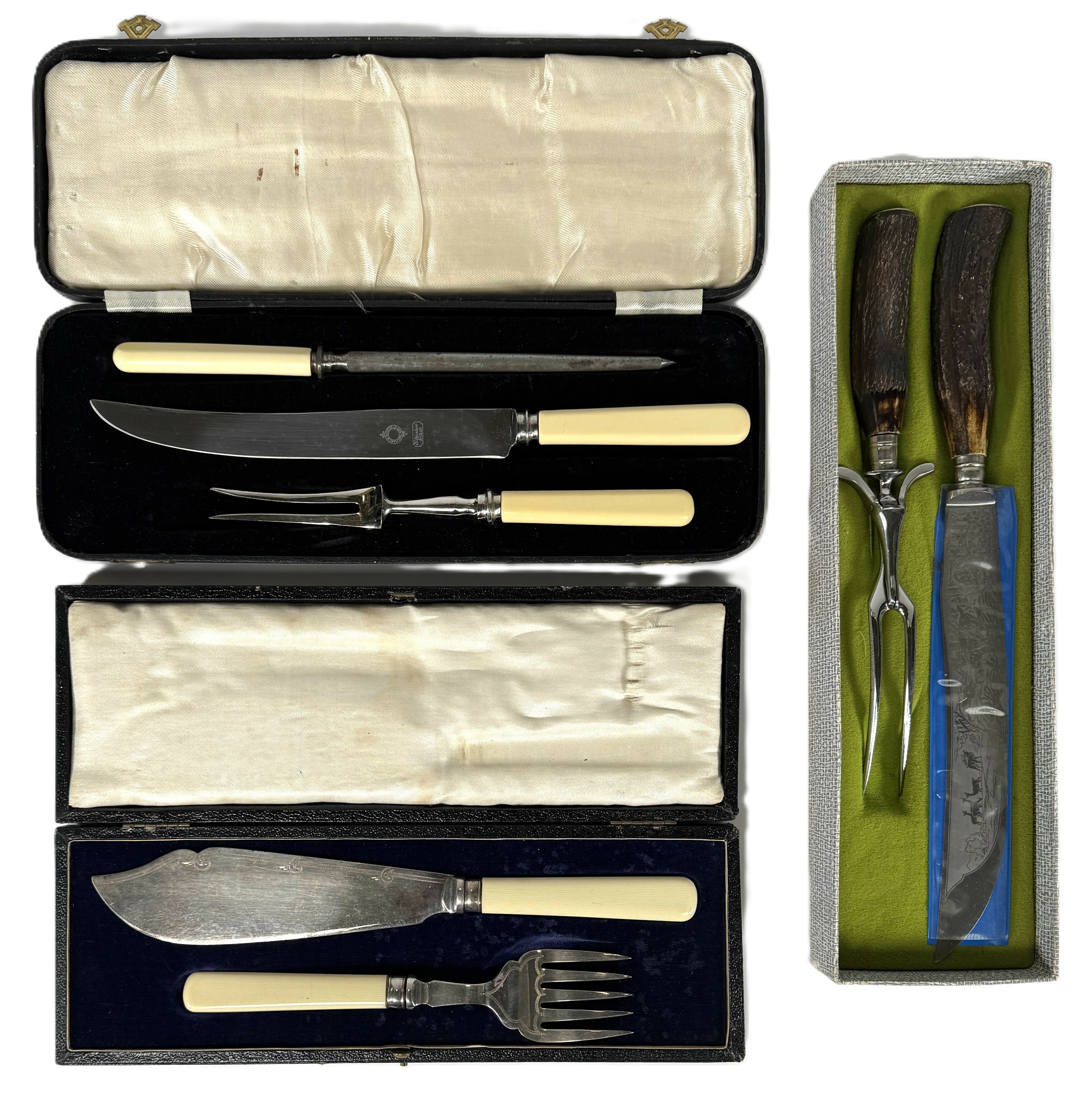 Drie sets vis- en vleesbestek uit midden 20e eeuw, bestaande uit staal met kunststof- en geweiheften, deels gegraveerd, in originele etuis met fluweel en zijde gevoerd interieur. De set met gewei is gemerkt Zwilling J.A. Henckels, een Duitse fabrikant uit Solingen en bevat een mes met gegraveerde jachtscène. Klaar om te bieden? Registreer je nu en doe mee aan de veiling! |