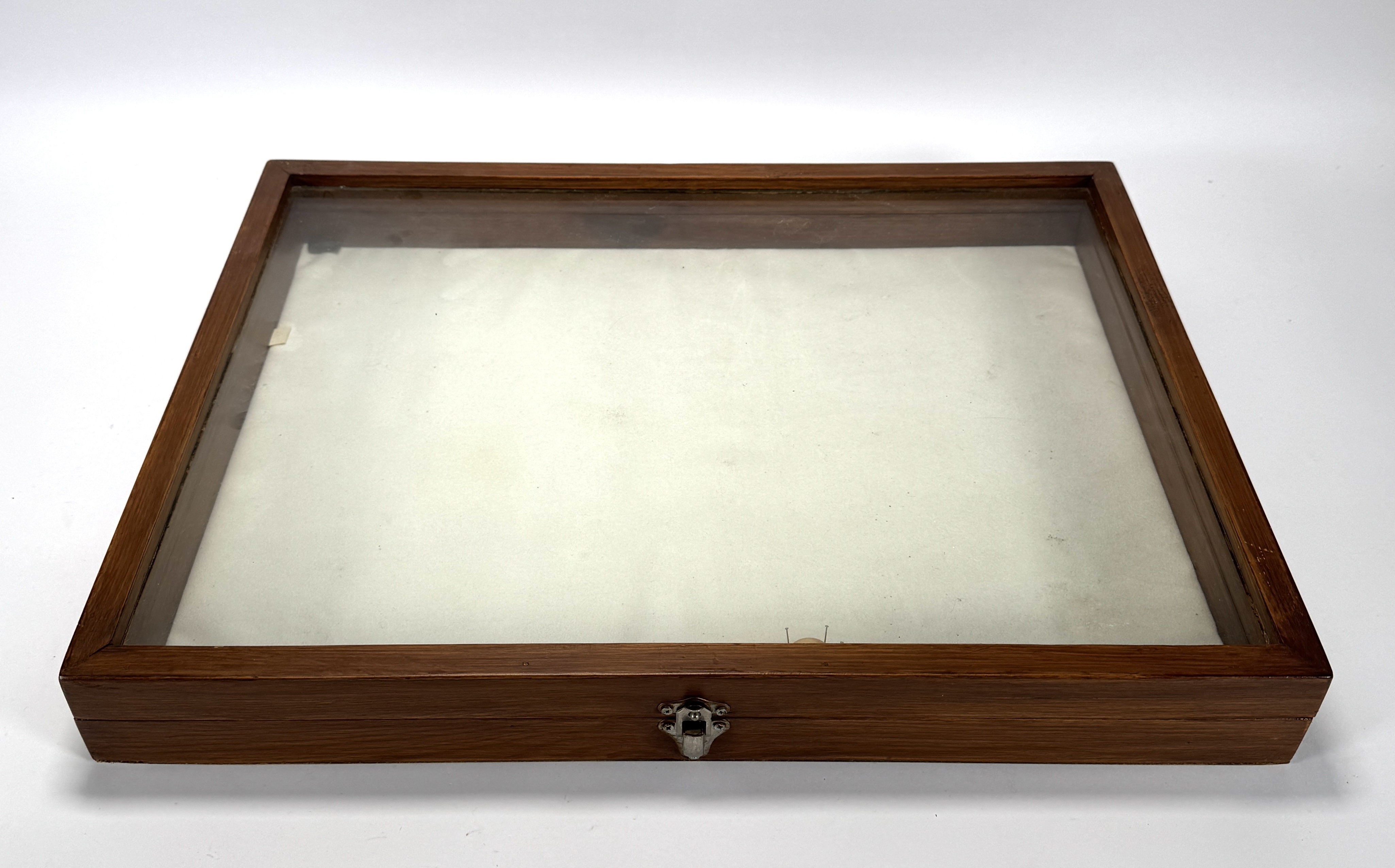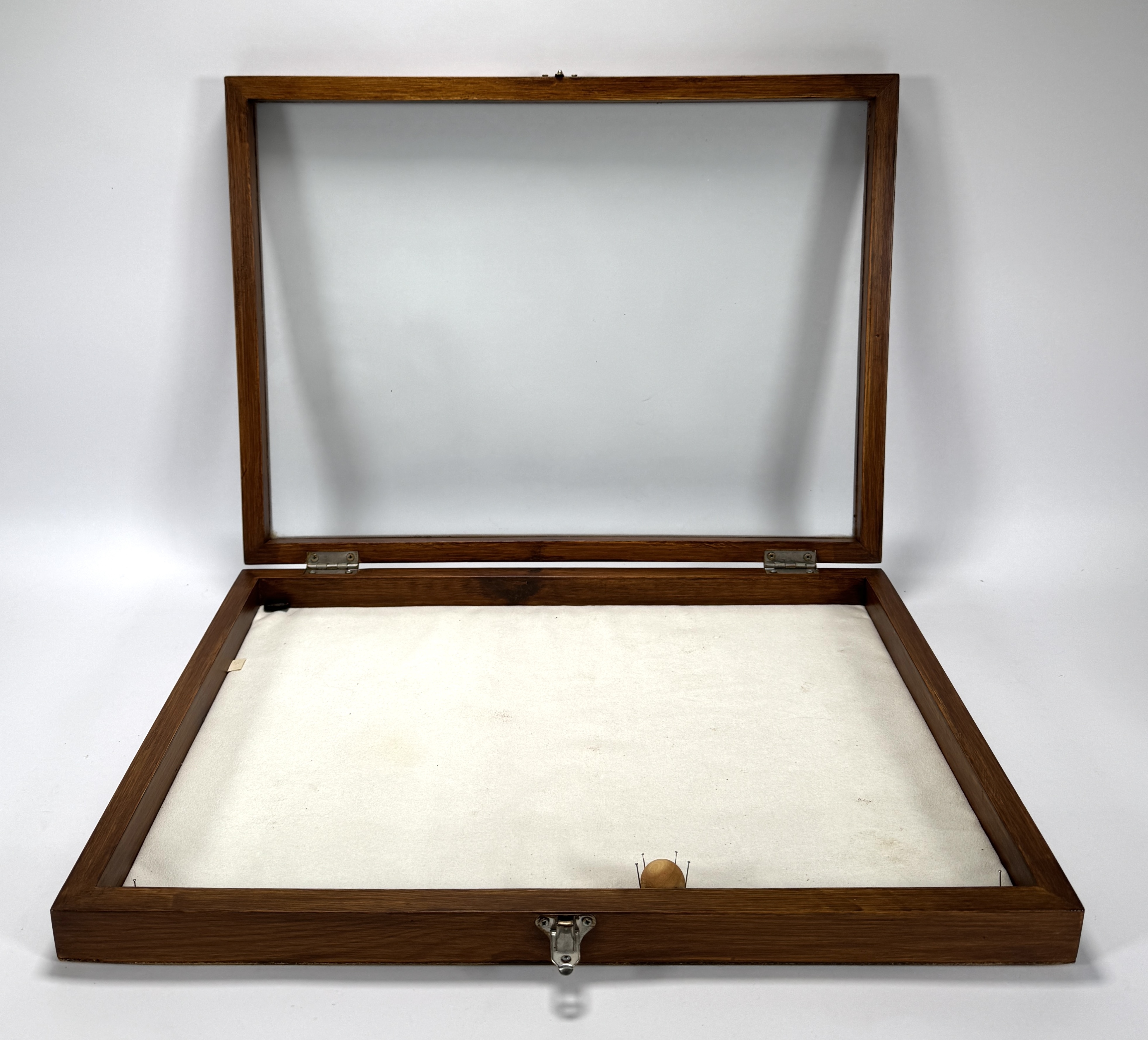 Entomologische vitrine met glazen deksel, gemaakt van hout en afgewerkt met een donkere beits, midden 20e eeuw. Het interieur bevat een prikbare ondergrond voor insecten en is voorzien van messing scharnieren en sluitwerk. Kom langs tijdens de kijkdagen (28 t/m 30 november) en ontdek de vitrine zelf |
