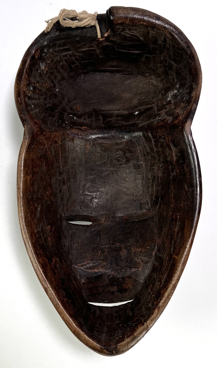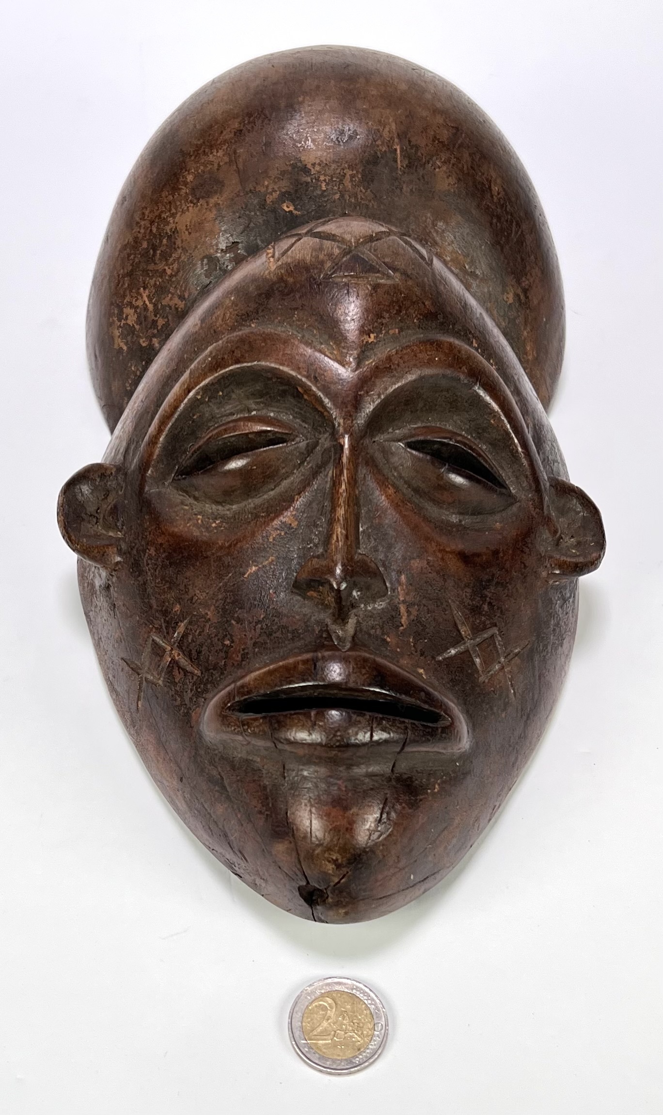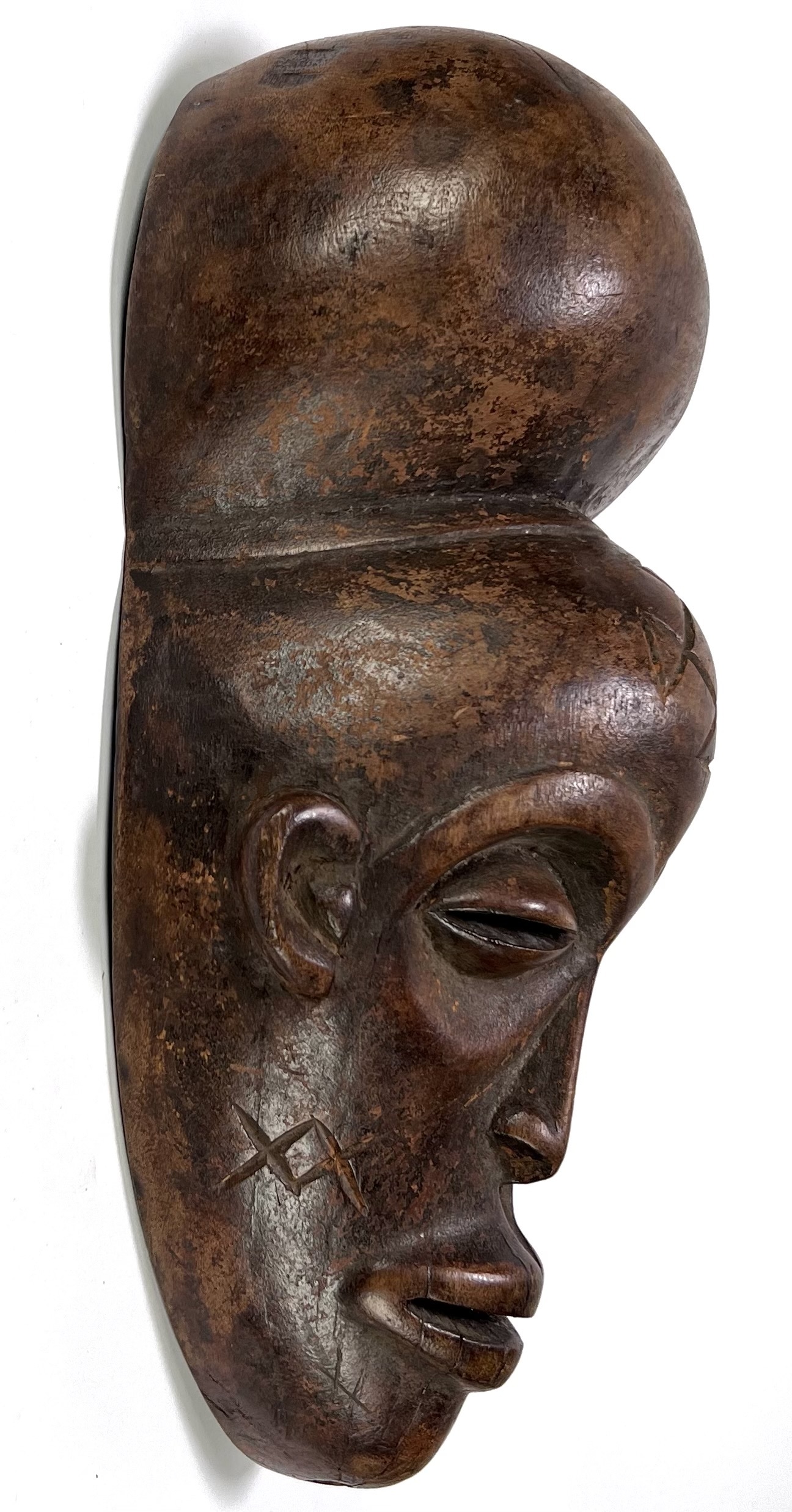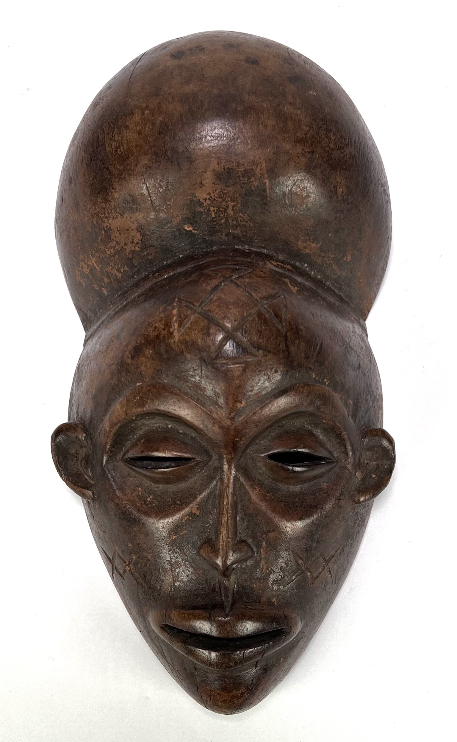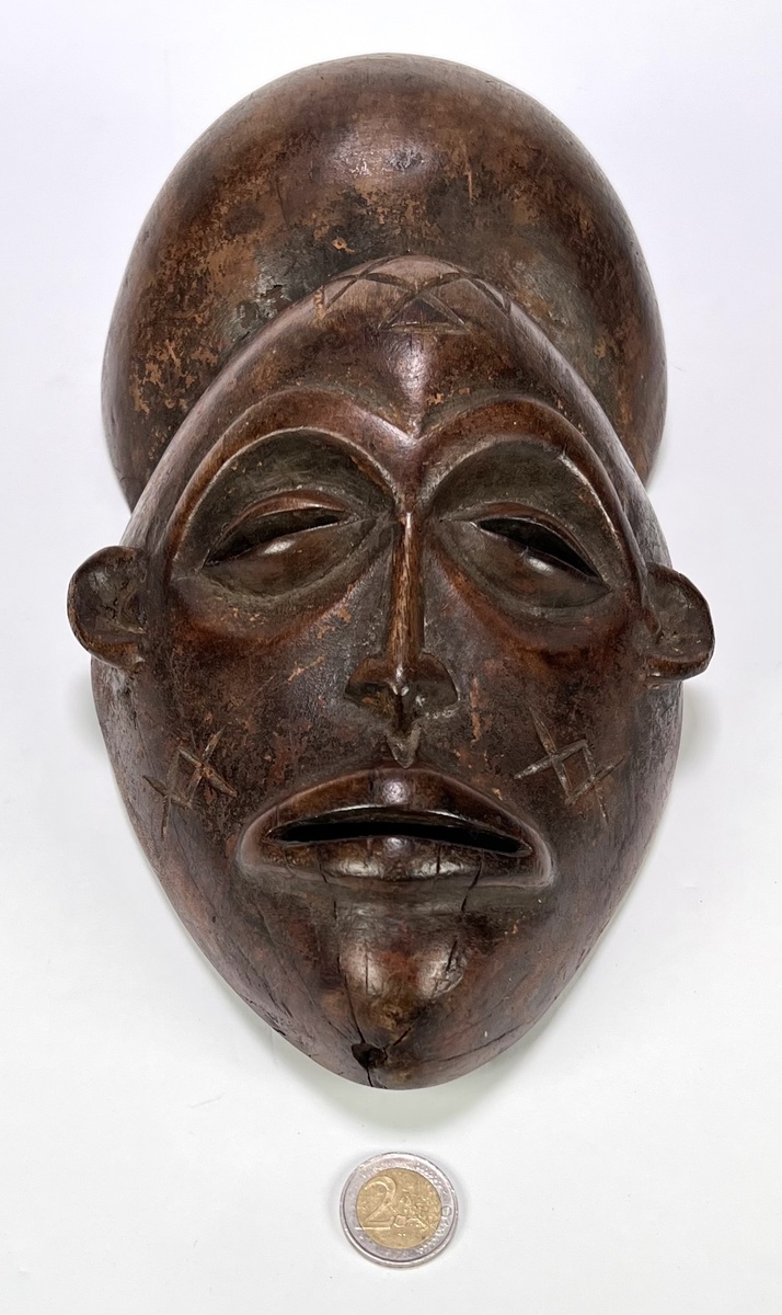 Gesneden houten Punu masker uit Gabon/Congo, met een donkere ingewreven patina en bolvormige coiffure, daterend uit het midden van de 20e eeuw. Het rituele gezichtsmasker is handmatig gesneden uit hardhout en vertoont de traditionele amandelvormige ogen en geaccentueerde scarificaties op voorhoofd en wangen. De stijl is typerend voor de Punu traditie en beeldt een geïdealiseerde voorouder uit. Registreer nu en bied eenvoudig online mee op dit object! |