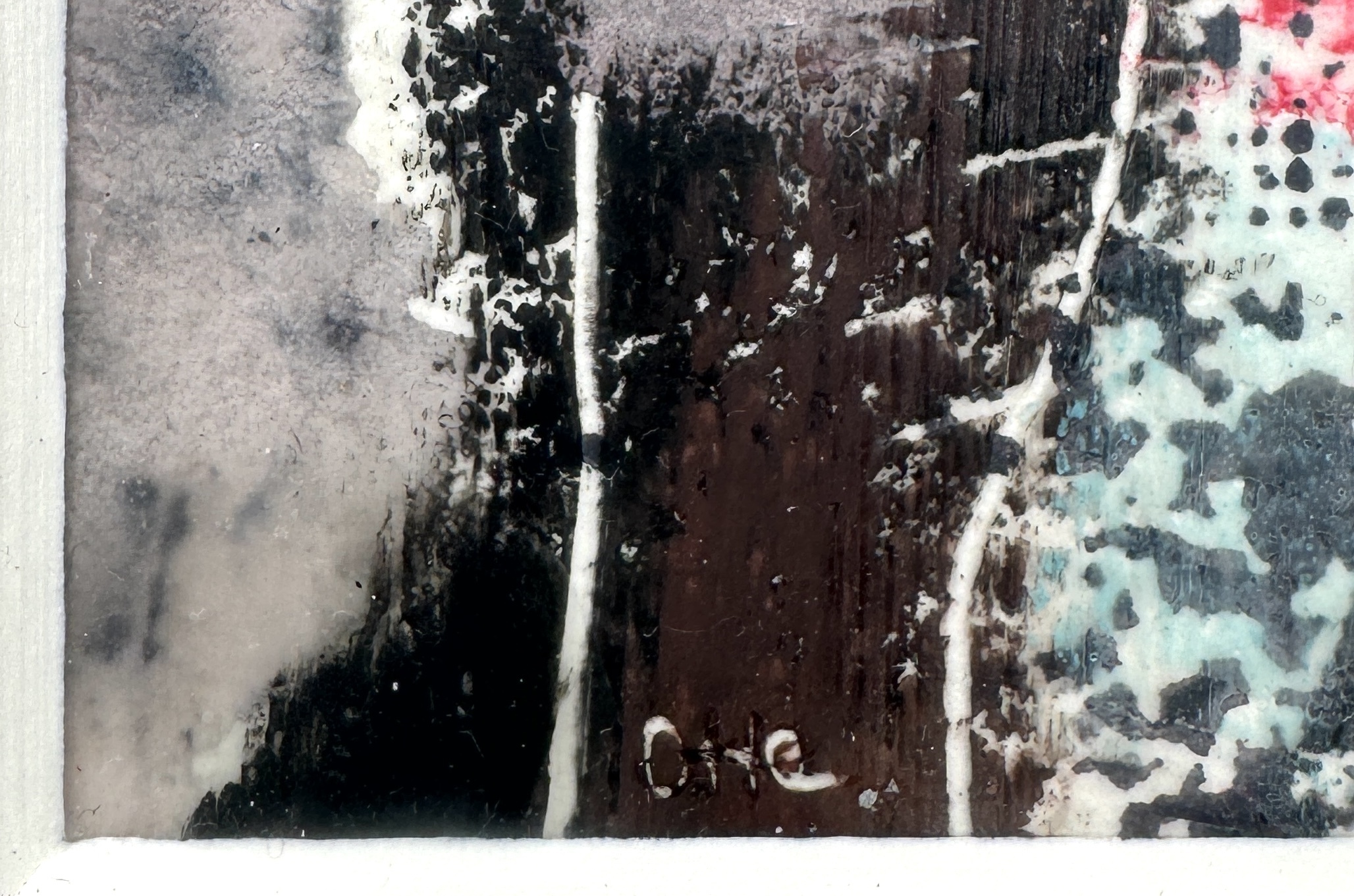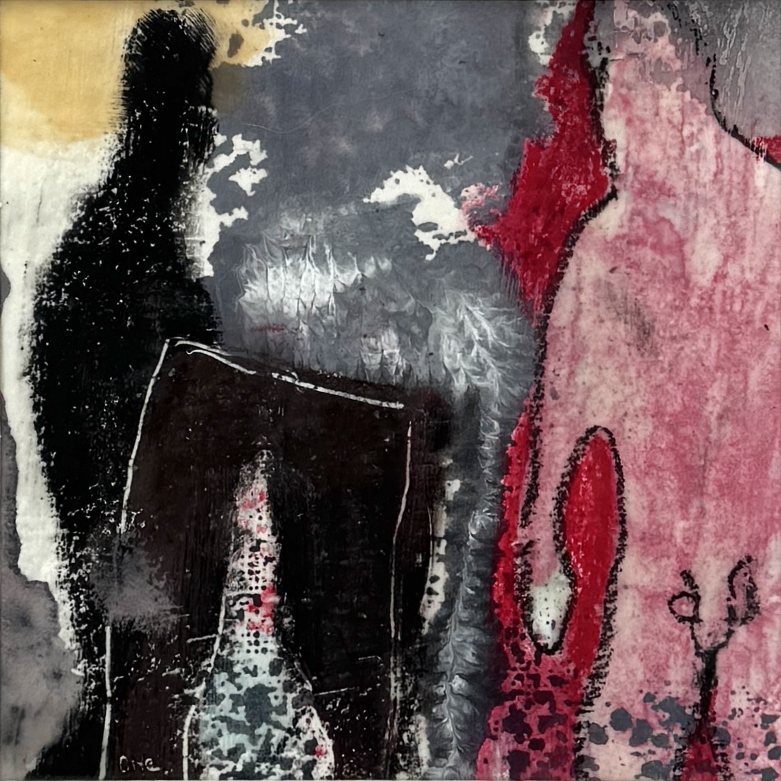 Expressief figuratief schilderij getiteld "Ohne Hose", bijenwas met pigmenten (encaustiek) door de Duitse kunstenares Susanne Otte (1968), gedateerd 2006. Het werk toont twee gestileerde figuren met sterke contrasten in zwart, rood en grijs en een gelaagde textuur van gesmolten was. Het schilderij is linksonder gesigneerd 'Otte' en werd in 2007 tentoongesteld in Galerie Perspektive. Geïnteresseerd? Bezoek onze kijkdagen op 28, 29 of 30 november van 11:00 tot 17:00 uur! |