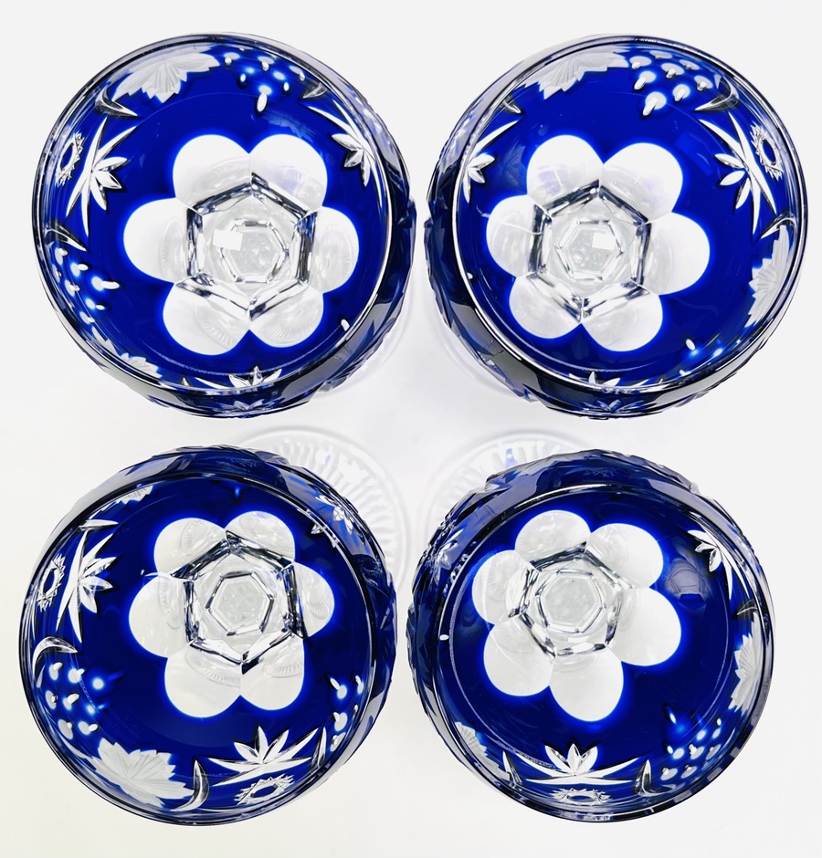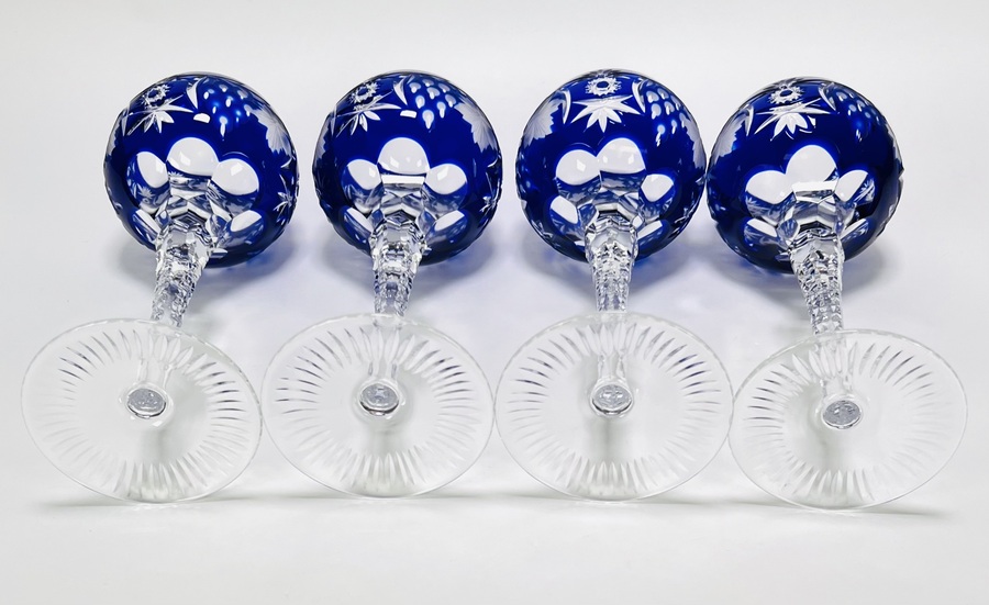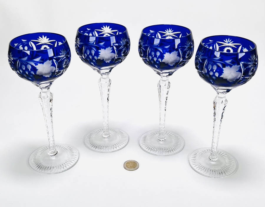 Vier wijnglazen, uitgevoerd in kristalglas, model Traube', van de Duitse fabrikant Nachtmann, dateren uit de midden 20e eeuw. De kobaltblauwe kom is voorzien van diep snijwerk dat een traditionele decoratie van druiventrossen en bladeren toont in overlay-techniek, met een geslepen getordeerde steel. Klaar om te bieden? Registreer je nu en doe mee aan de veiling! |