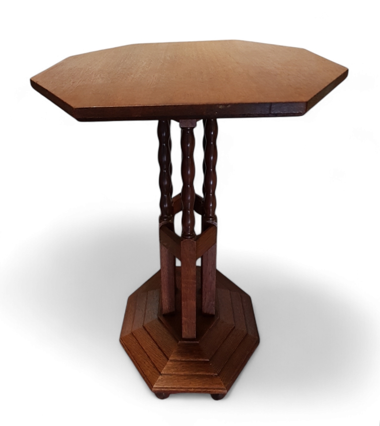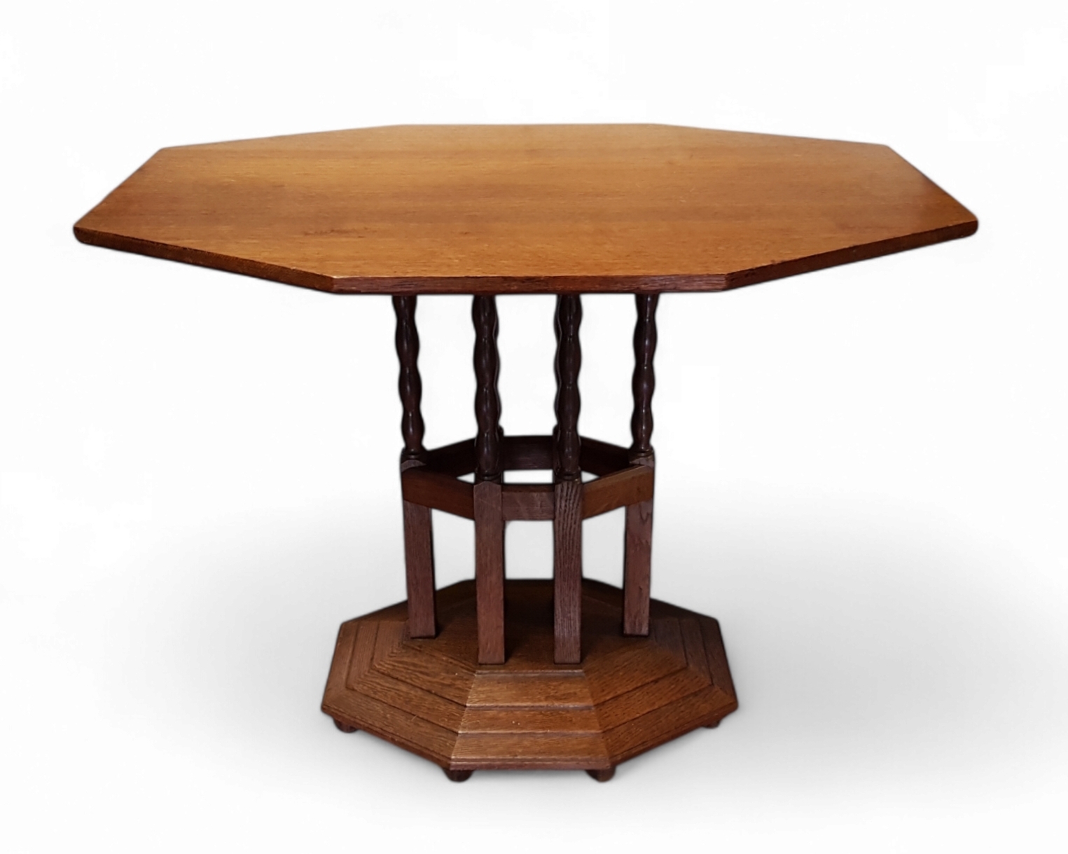 Achthoekige eikenhouten tafel in de landelijke stijl met Arts & Crafts-invloeden uit circa 1900–1920. De tafel is gemerkt met een plaatje van meubelmaker Pander en Zonen, de toonaangevende Haagse fabrikant. De centrale voet kenmerkt zich door vier zware, getorste palisanderhouten poten. Kom langs tijdens de kijkdagen (28 t/m 30 november) en ontdek deze tafel zelf! |