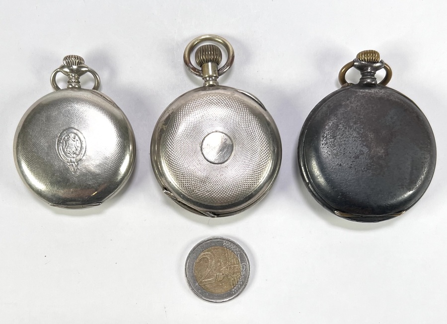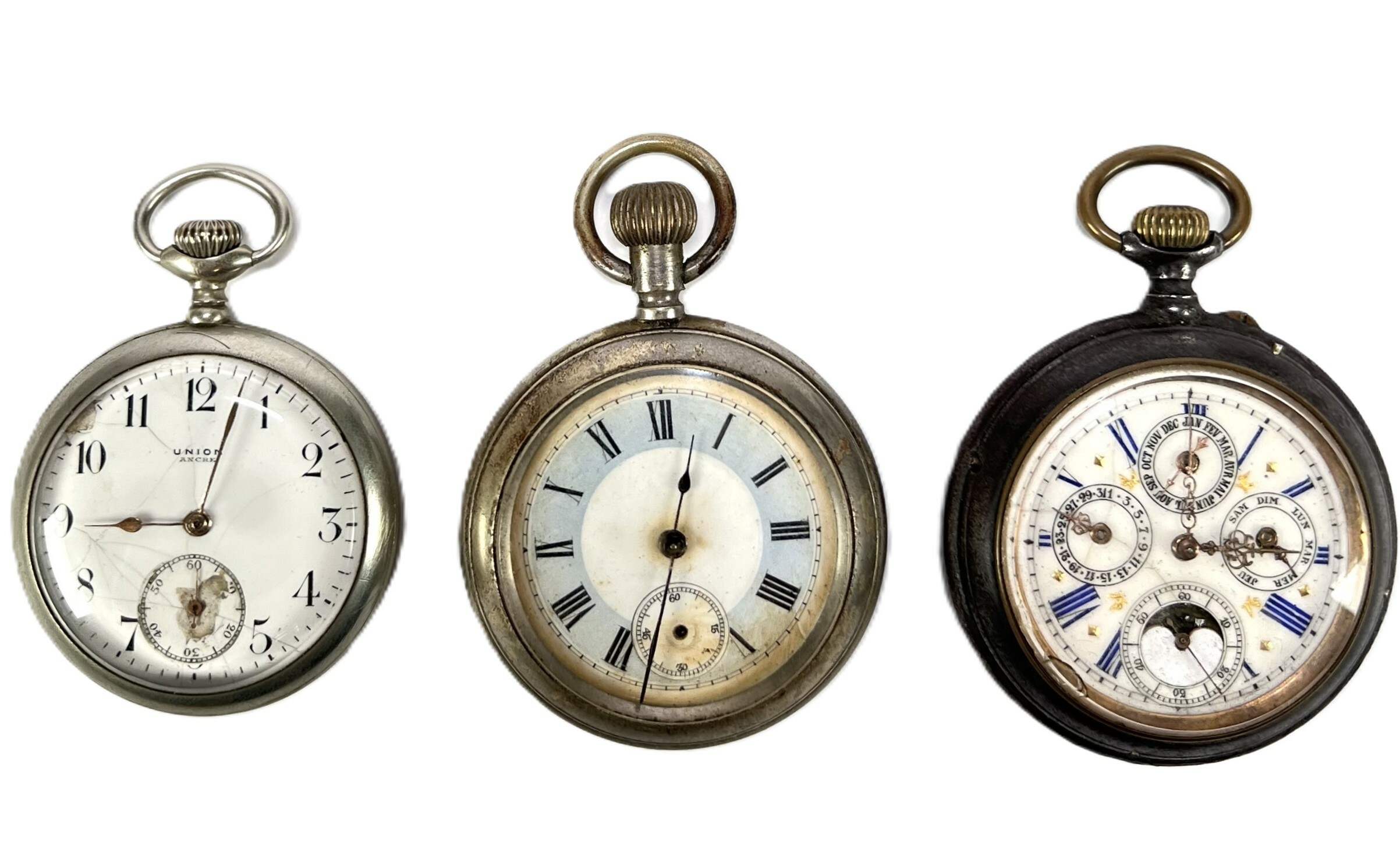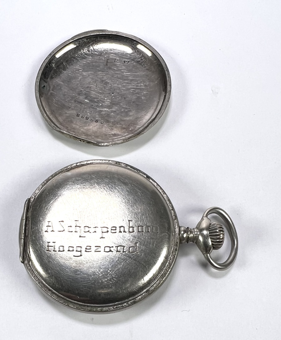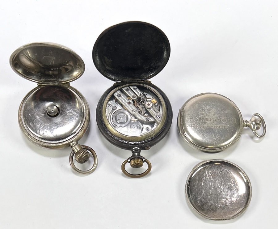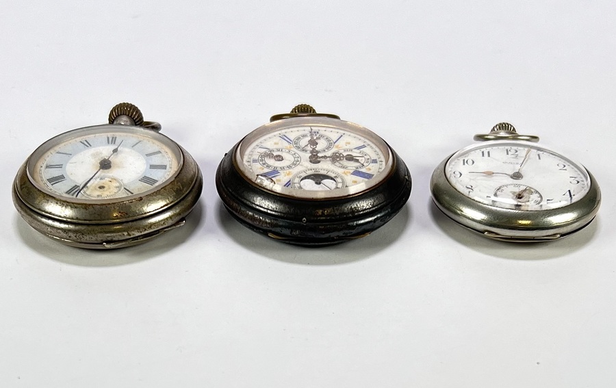 Drie antieke mechanische zakhorloges, vervaardigd uit wit metaal, circa 1890–1920. Een zakhorloge is een Triple Calendar Moonphase met complexe aanduidingen en een blauw gedecoreerde wijzerplaat, een horloge draagt de inscriptie "A Scherpenborg Hoogezand". Geïnteresseerd? Bezoek onze kijkdagen op 28, 29 of 30 november van 11:00 tot 17:00 uur! |