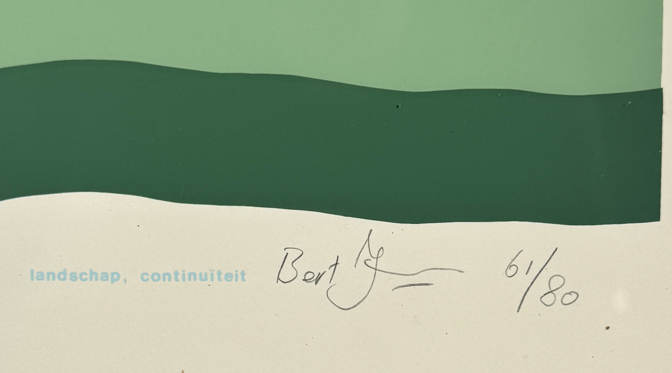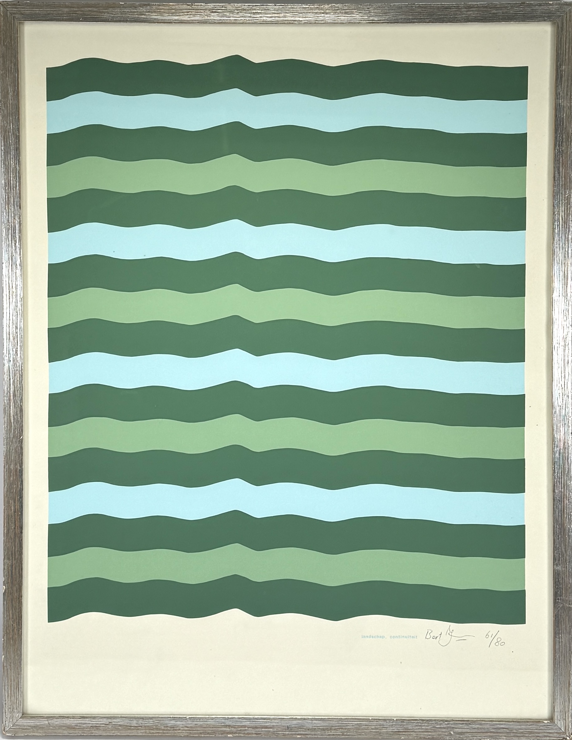 Zeefdruk door Bert J, getiteld "landschap, continuïteit", uitgevoerd in strakke kleuren op papier. Dit abstracte werk uit circa 1975 toont een minimalistisch repeterend lijnenspel van golvende groene en blauwe banen. Het grafische kunstwerk is rechtsonder met tekst getiteld, met potlood gesigneerd en vermelding oplagenummer 61/80. Wil je direct deelnemen? Plaats vanaf 21 november alvast een schriftelijk bod via onze website! |