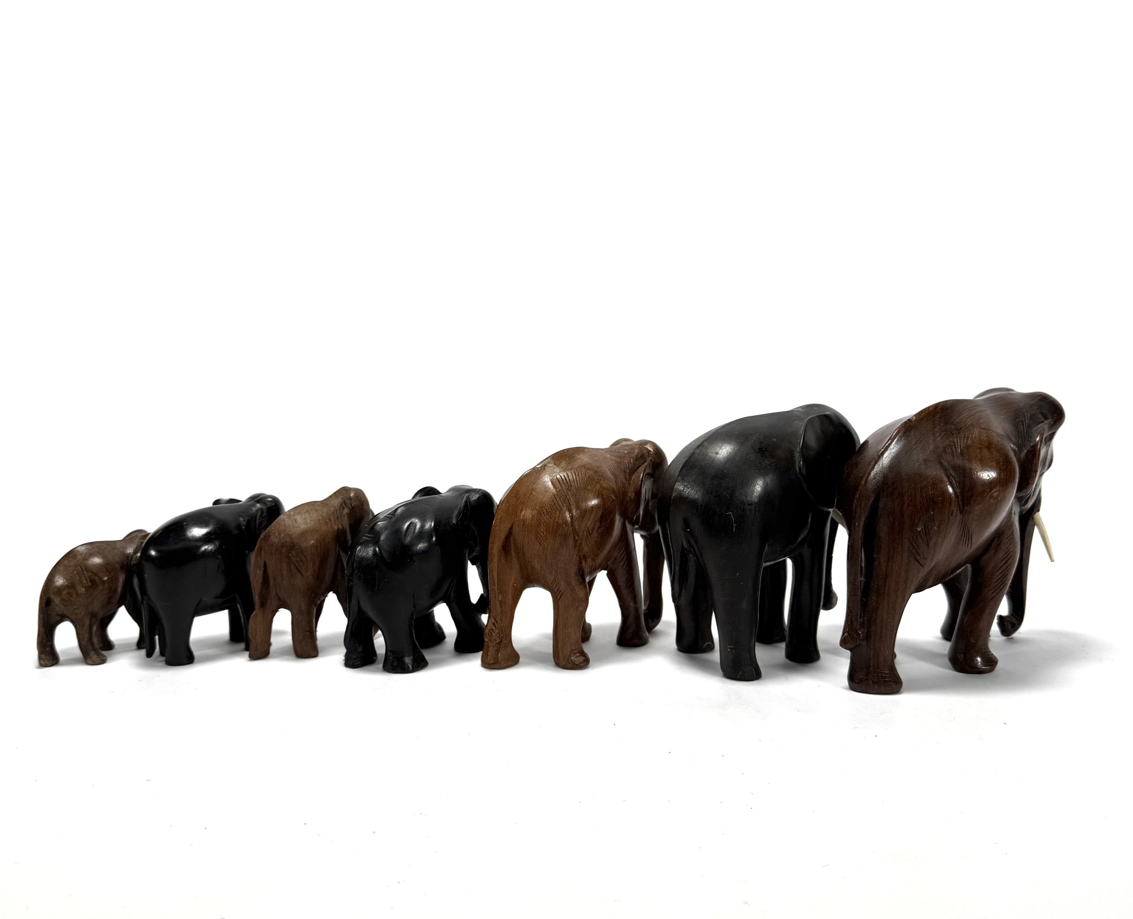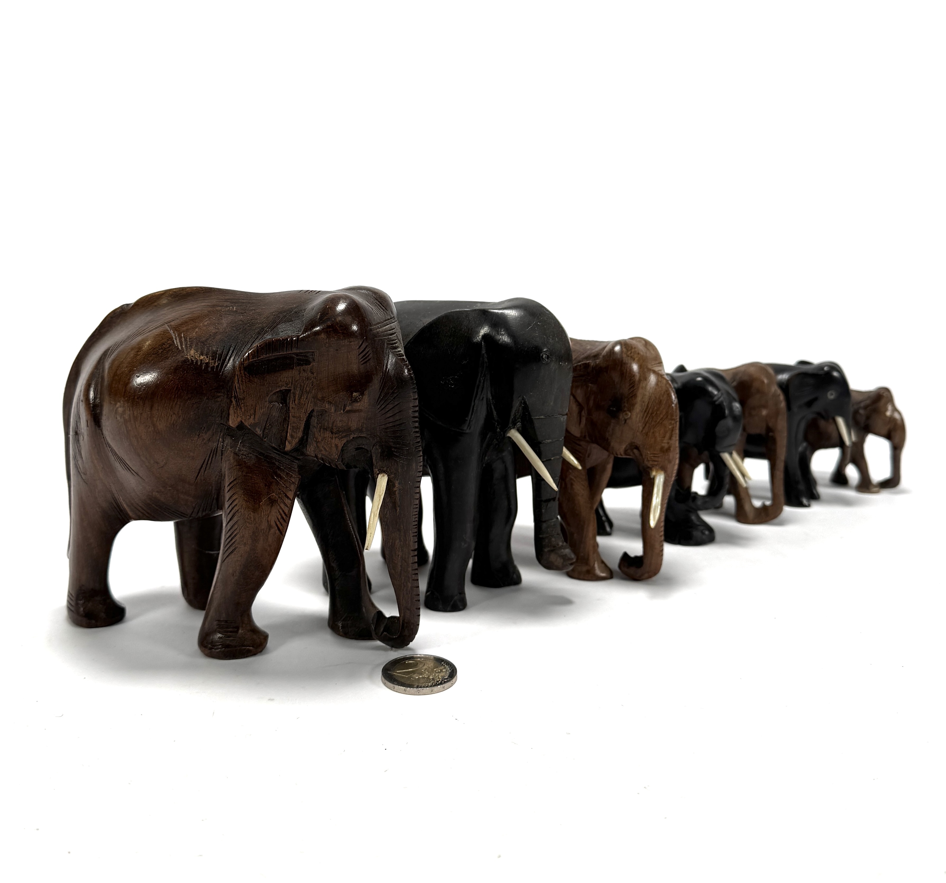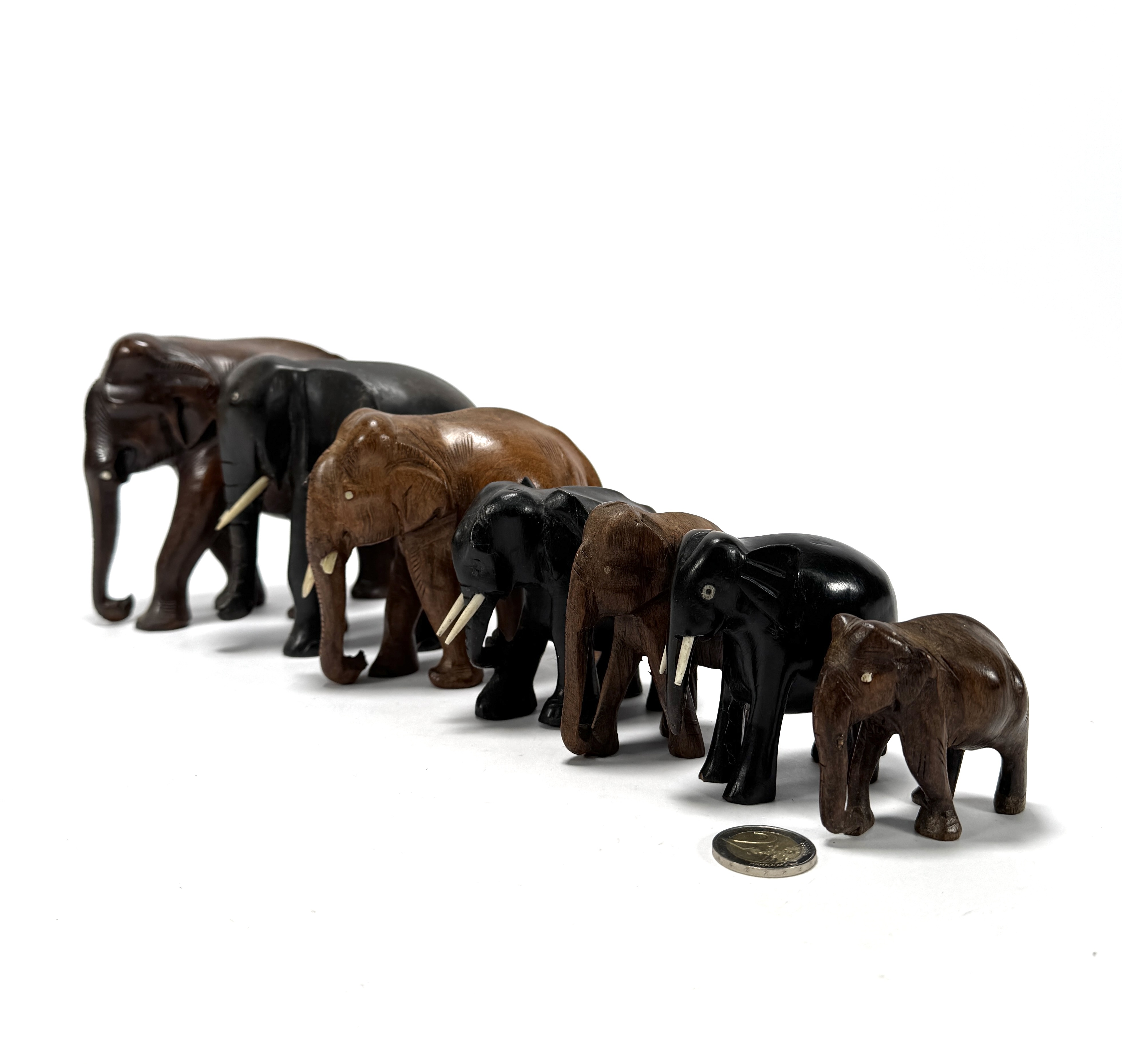 Set van zeven Afrikaanse olifanten, uitgevoerd in hout met houtsnijwerk, tweede helft 20e eeuw. De beeldjes variëren in formaat en tonen naturalistisch uitgewerkte details zoals oren, poten en slagtanden, waarvan enkele zijn uitgevoerd in been. Geïnteresseerd? Bezoek onze kijkdagen op 28, 29 of 30 november van 11:00 tot 17:00 uur! |