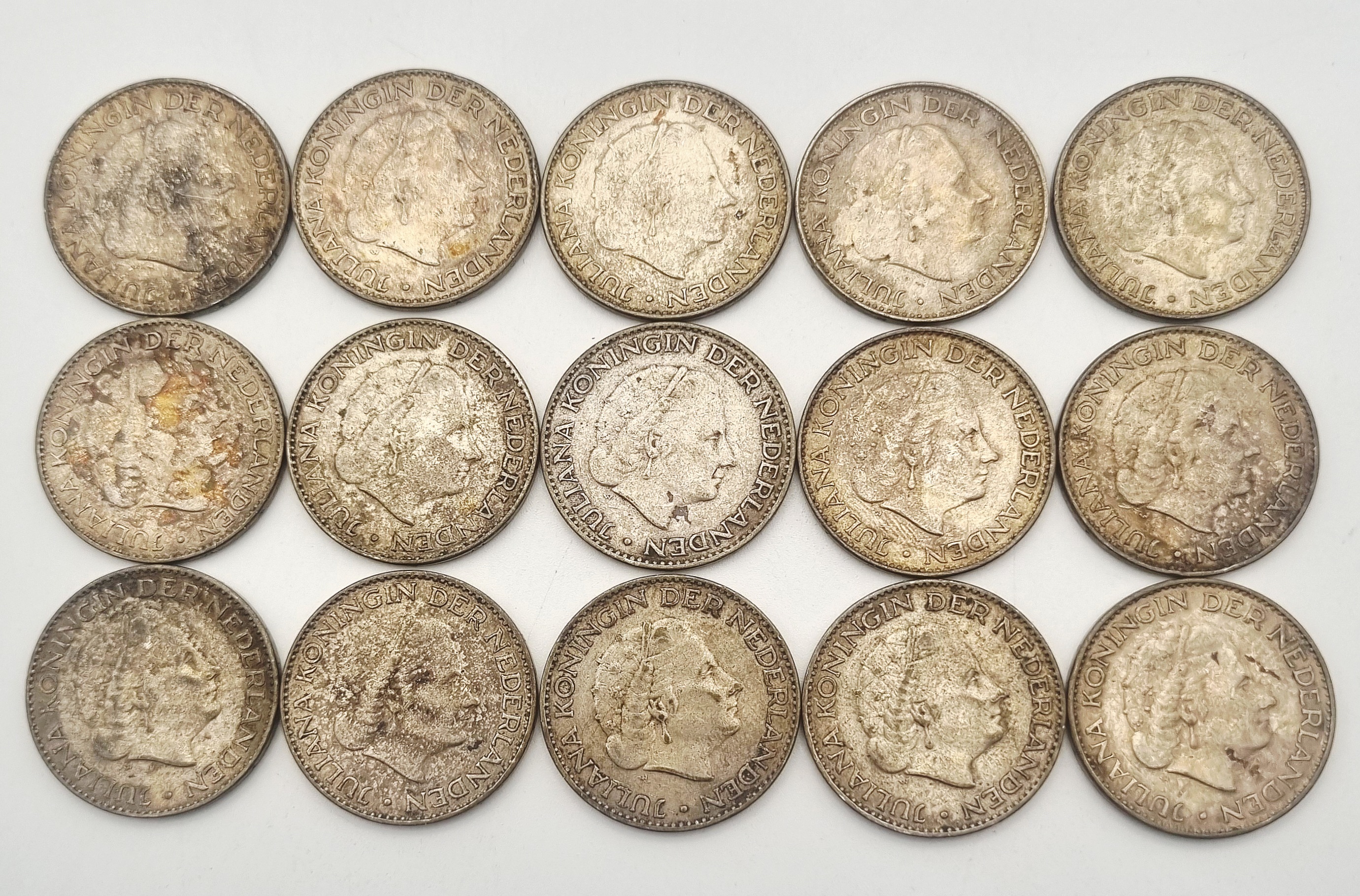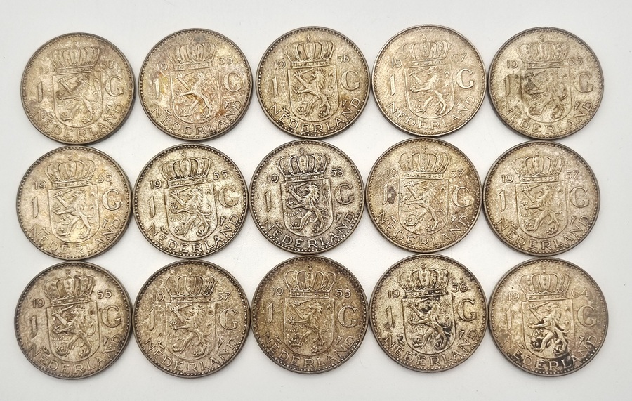 Vijftien zilveren guldens met een gehalte van 720/1000, geslagen in de periode 1955–1967. De munten tonen het portret van Koningin Juliana op de voorzijde en het gekroonde Nederlandse wapen op de keerzijde. Geïnteresseerd? Bezoek onze kijkdagen op 28, 29 of 30 november van 11:00 tot 17:00 uur! |