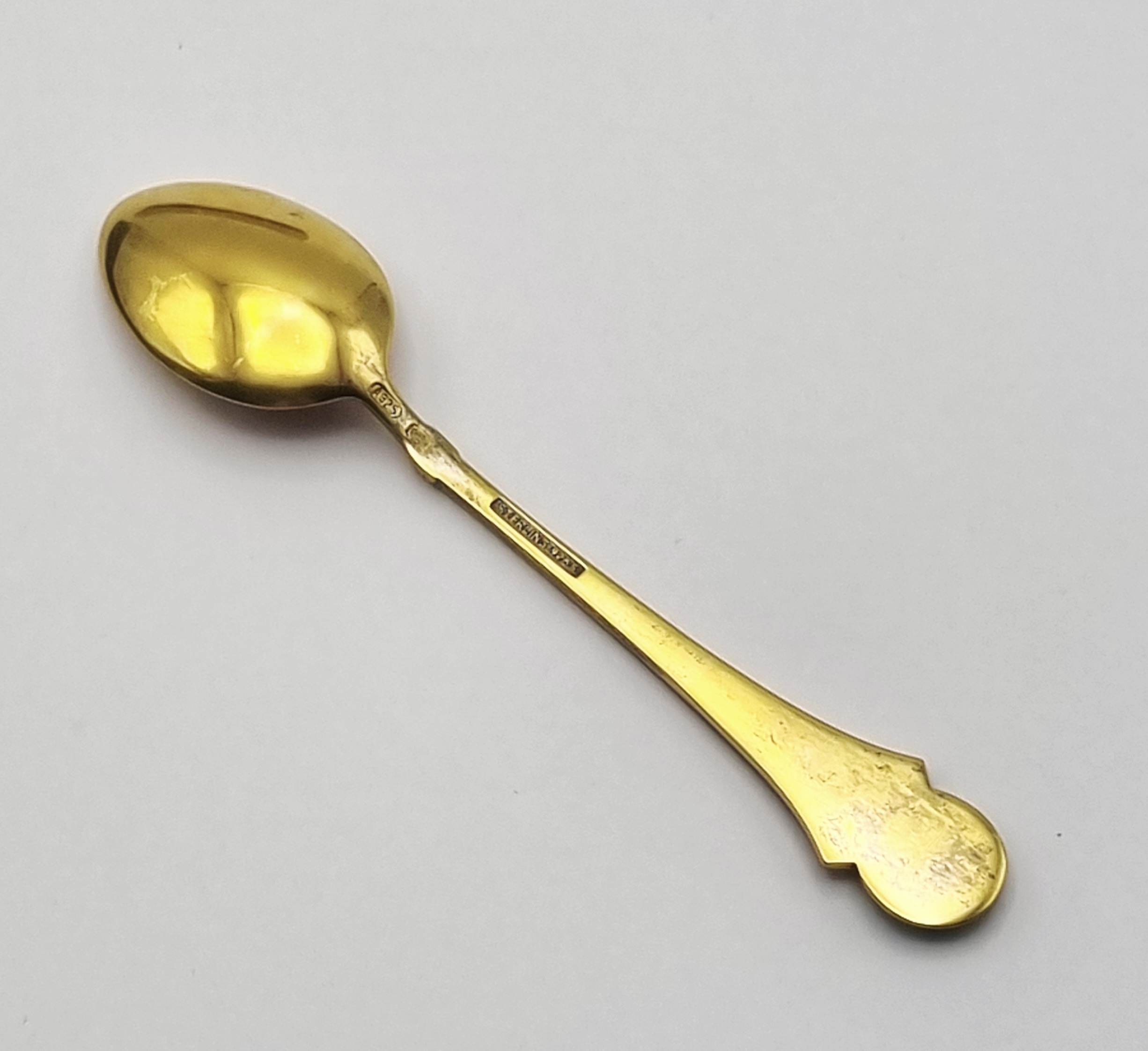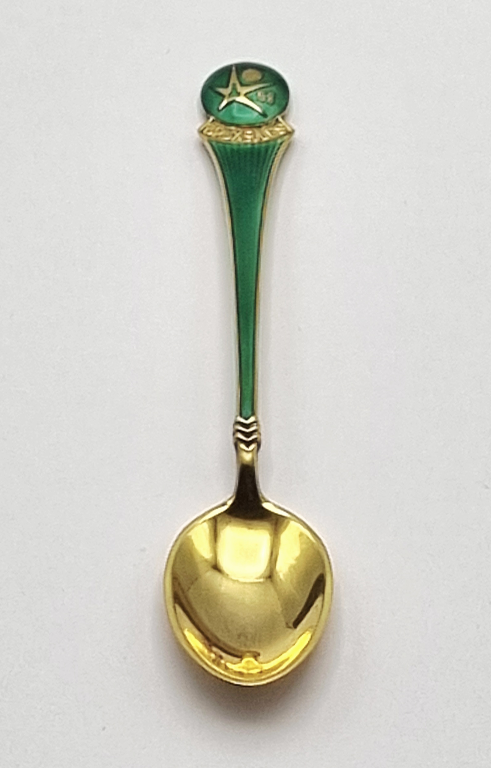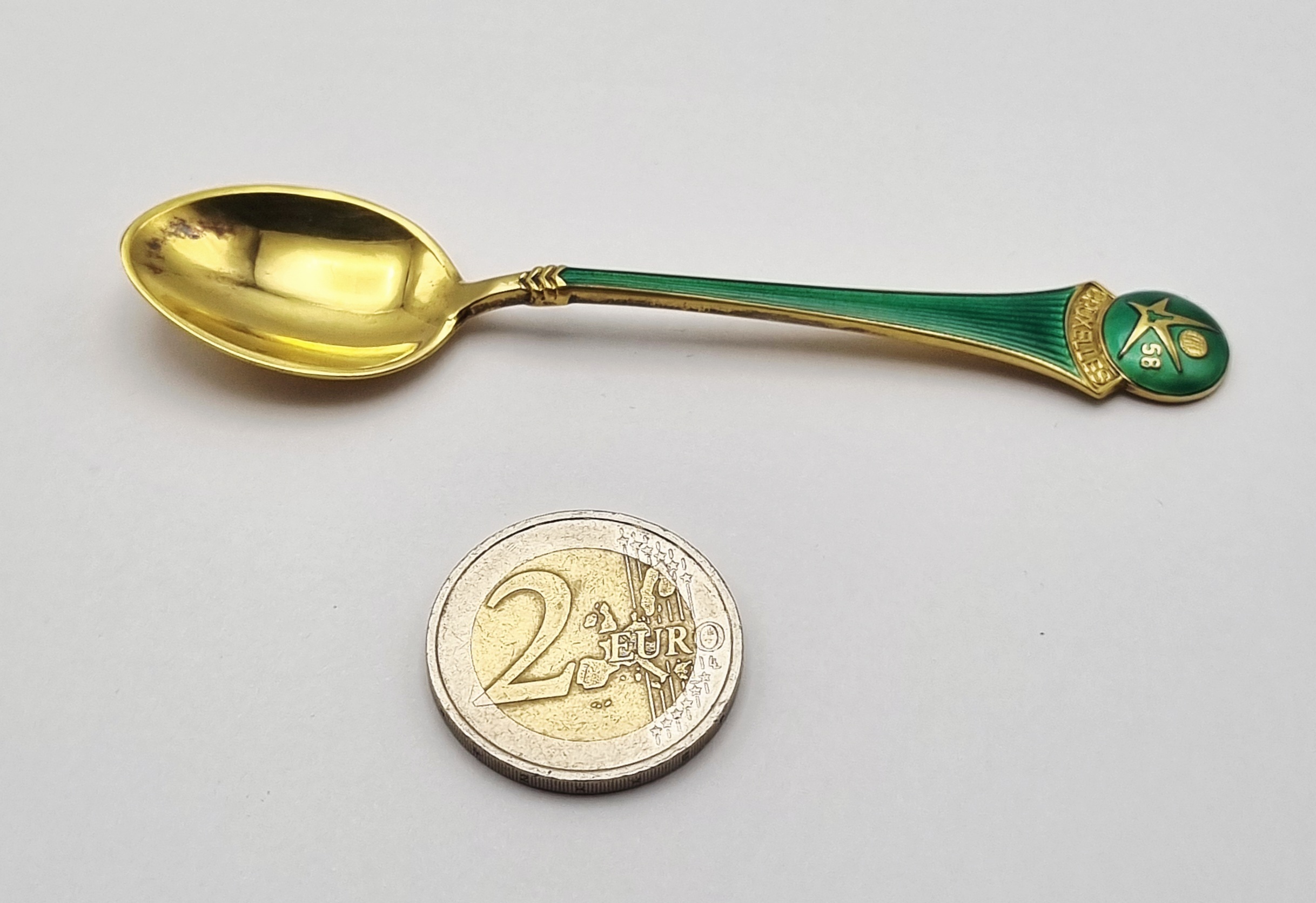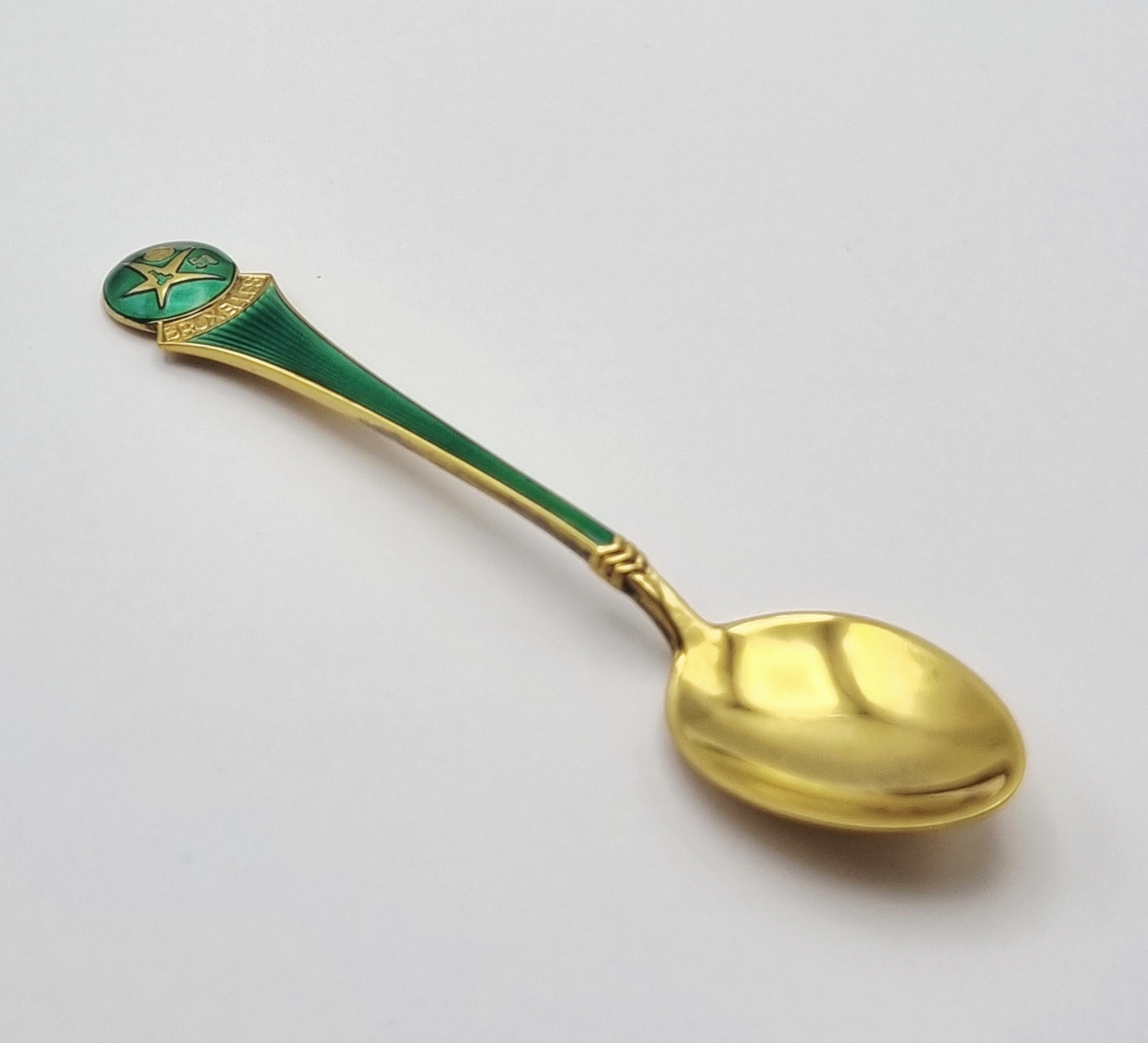 Verguld zilveren theelepel (Sterling Silver 925/1000), voorzien van een geëmailleerde bekroning, uitgegeven ter gelegenheid van de Wereldtentoonstelling in Brussel (Expo 58). Het ontwerp is Mid-century modern en toont het jaartal '58' en 'BRUXELLES' in goudkleur op groen emaille (champlevé). De bak van de lepel is geheel verguld, in de originele doos. Dit geëmailleerde theelepel zelf beoordelen? Je bent welkom op onze kijkdagen op 28, 29 en 30 november! |