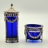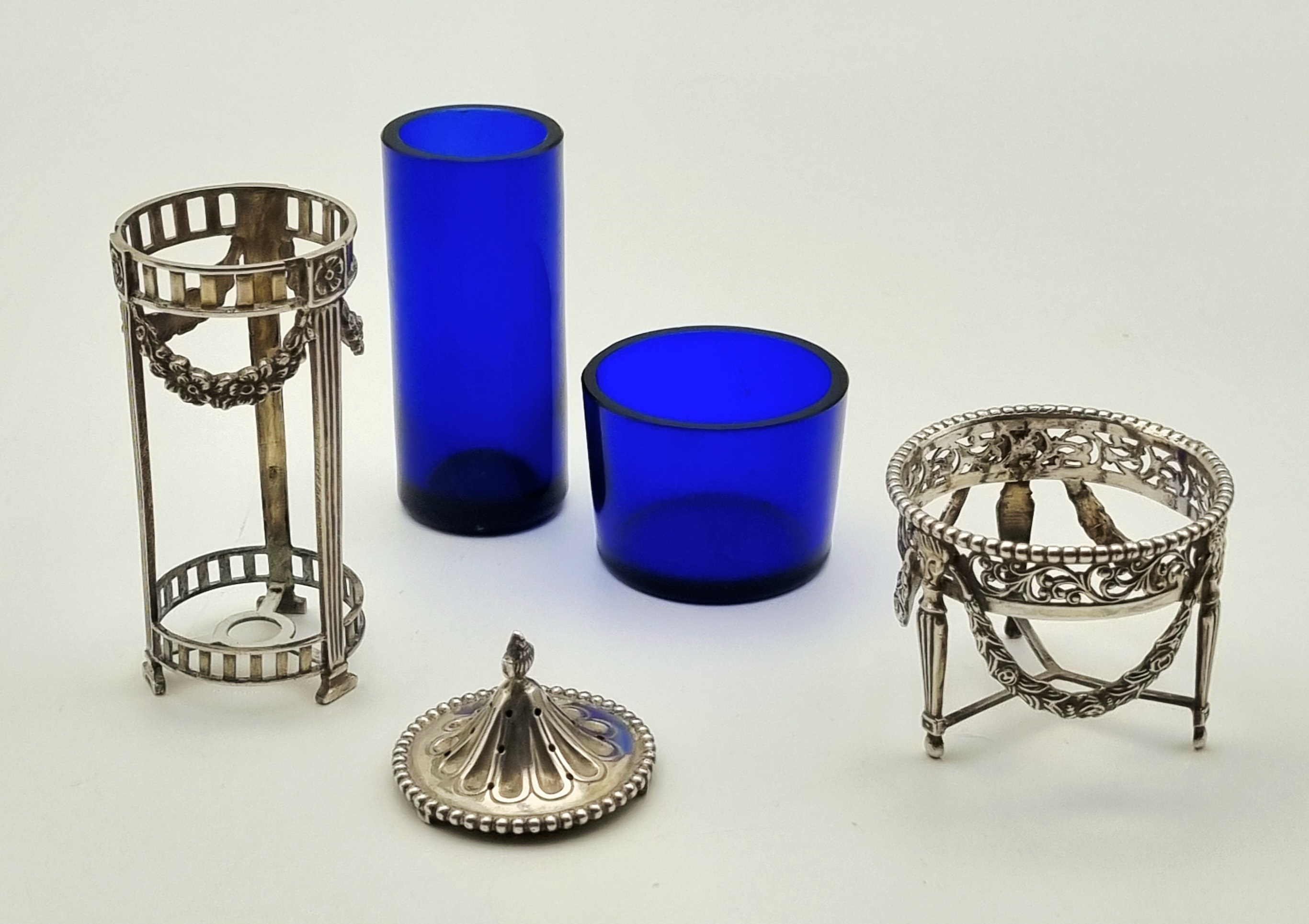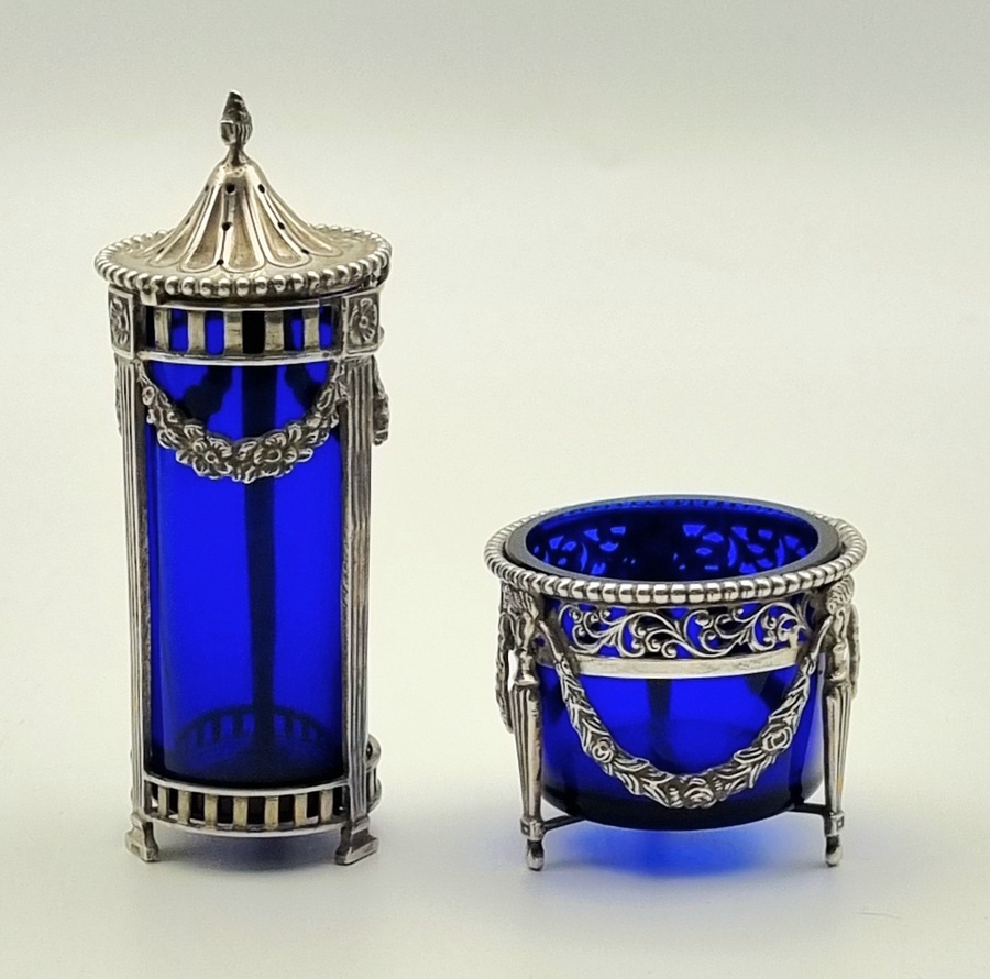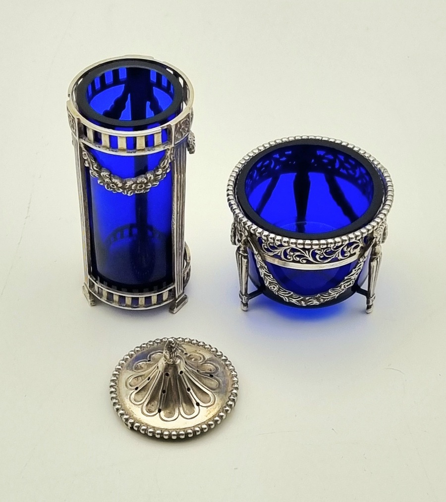 Zilveren zoutstrooier en een zoutvaatje met uitneembare kobaltblauwe glazen inzetten uit de 19e eeuw, van Nederlandse herkomst en zijn gemerkt met het zwaardje. De neoclassicistische stijl is duidelijk zichtbaar door de opengewerkte monturen met zuilpoten, guirlande-decoraties en een parelrand aan de randen. Geïnteresseerd? Bezoek onze kijkdagen op 28, 29 of 30 november van 11:00 tot 17:00 uur! |