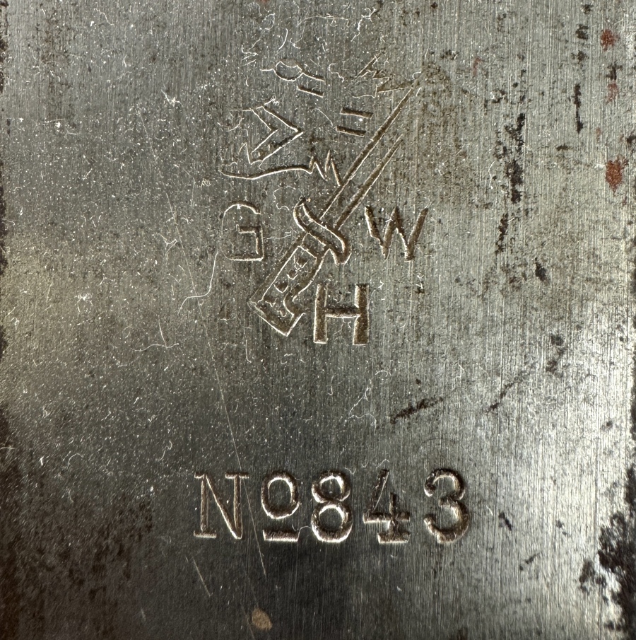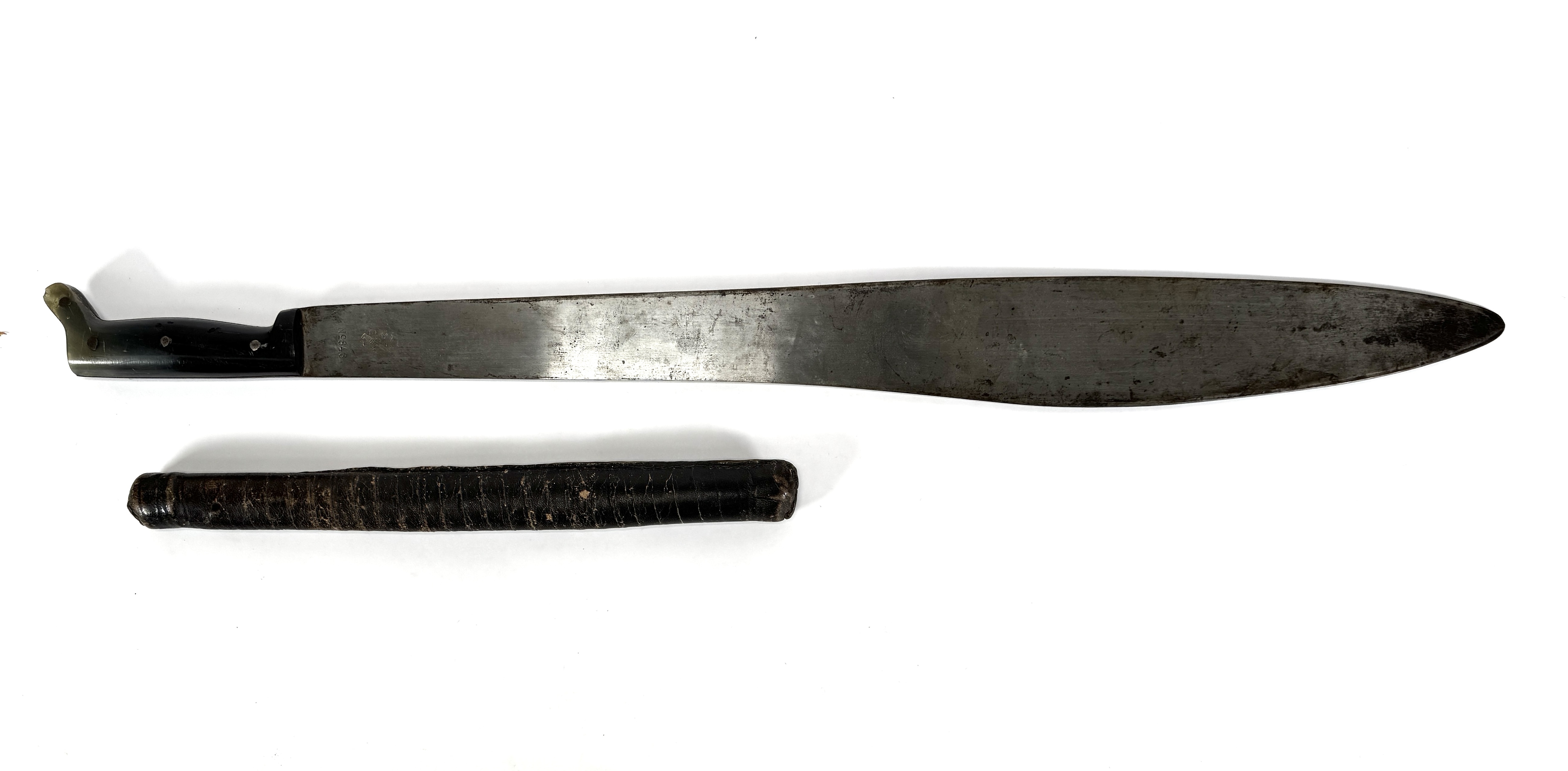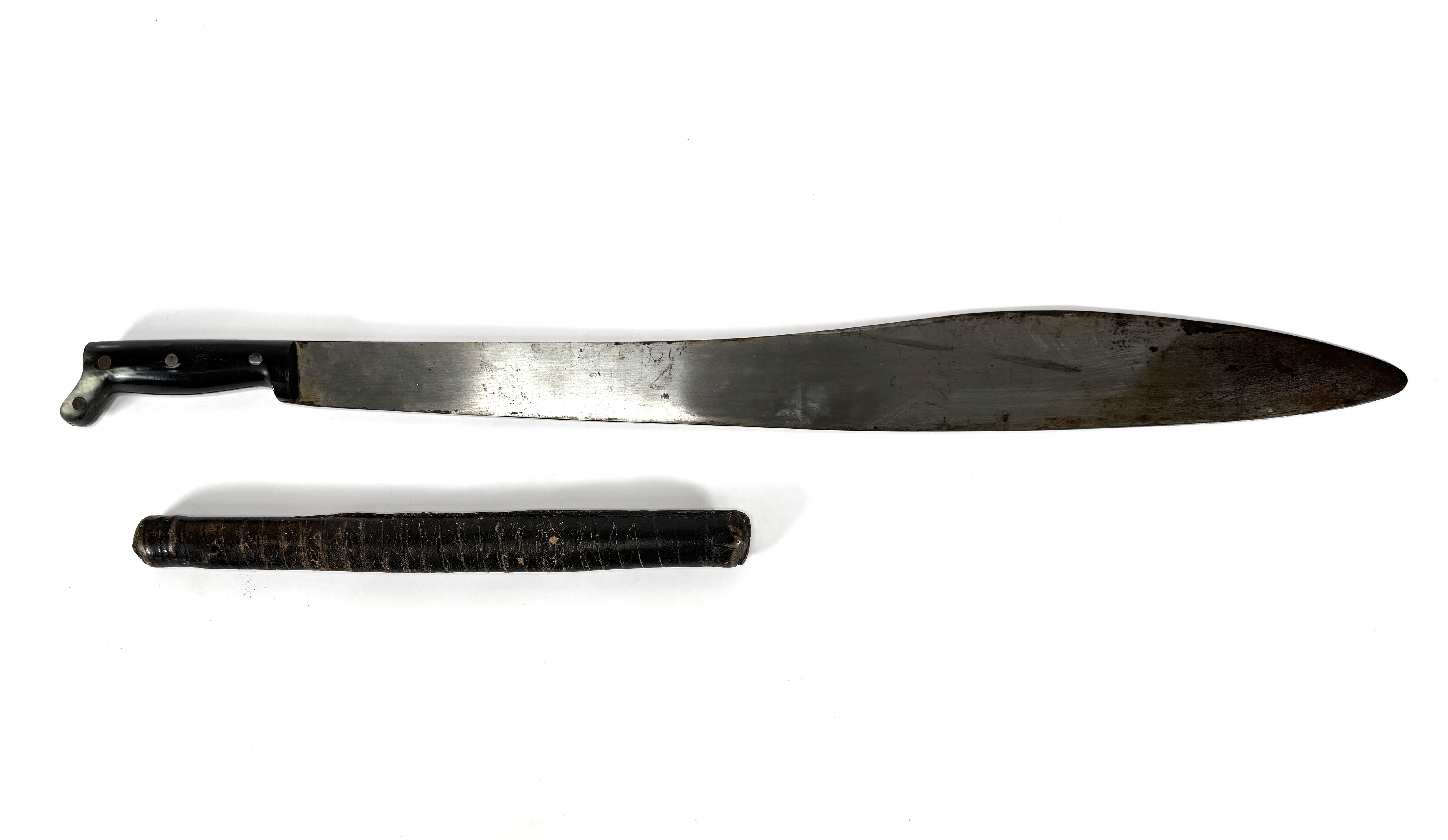 Kapmes met licht gebogen stalen lemmet en zwart handvat met gekromd hoornstuk en klinknagelbevestiging, vergezeld van leren knuppel. Het kapmes heeft rechte rug en verbrede punt, gesigneerd met initialen "G W H" en serienummer "Nº 843" op de kling. Vervaardigd in Zuidoost-Azië, eerste helft 20e eeuw. Het object combineert industriële met handmatige productie en vertoont sporen van praktisch gebruik. Wil je de kavel in het echt bekijken? Kom naar de kijkdagen op 28, 29 en 30 november! |