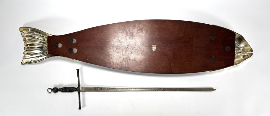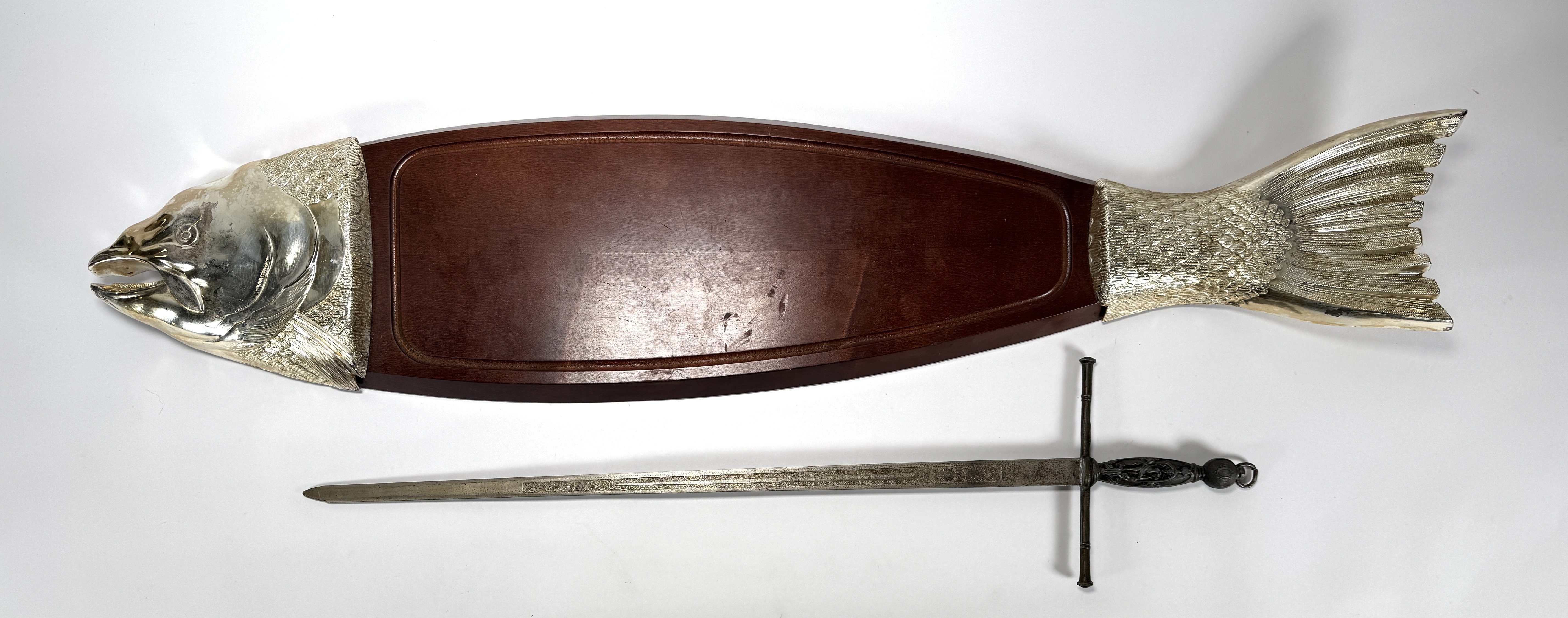 Houten vis serveerplank en decoratieve degen, tweede helft 20e eeuw
