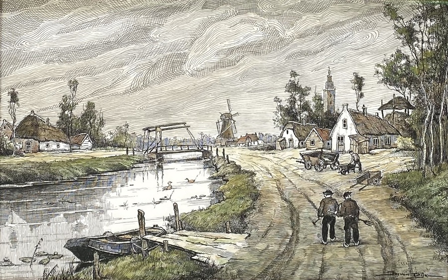 Pentekening met aquarel op papier is rechtsonder gesigneerd door de Nederlandse schilder Jos van Dijk (1913–1998). Het werk uit de midden 20e eeuw toont een naturalistisch dorpsgezicht met een ophaalbrug, molen en kerk langs een vaart. De techniek combineert een gedetailleerde lijntekening in inkt met lichte aquarelwassingen.