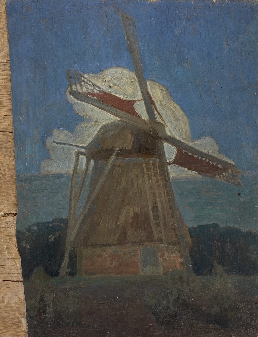 Olieverf op triplex met voorstelling van een Hollandse windmolen tegen een blauwe lucht met wolken, uitgevoerd in realistische stijl met impressionistische penseelvoering, daterend uit het begin van de 20e eeuw. Het kleurgebruik is levendig, met contrast tussen lucht en landschap.