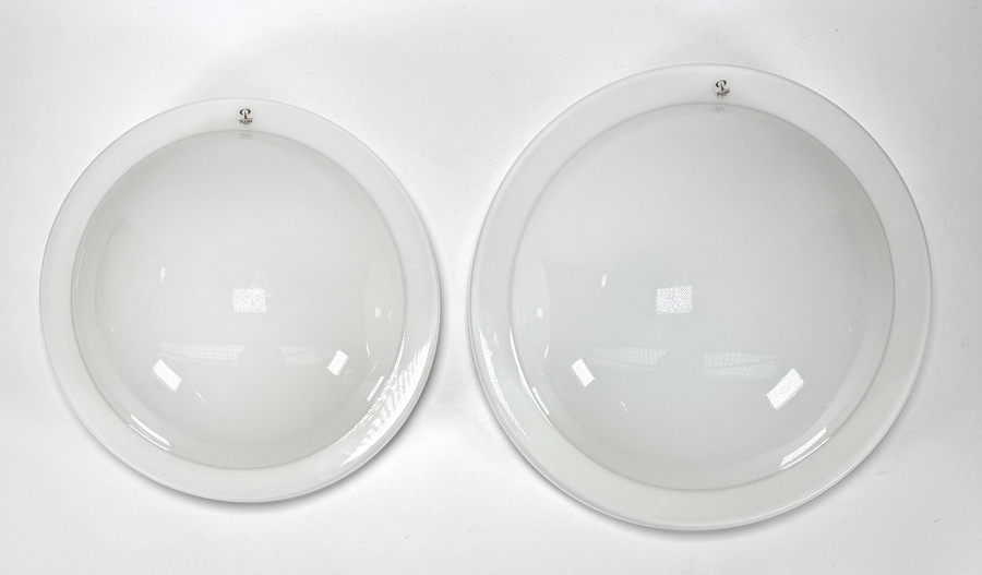 Twee plafondlampen van de Duitse fabrikant Peill & Putzler, daterend uit de jaren 1970. De set bestaat uit een groter en een kleiner model, beide uitgevoerd in mondgeblazen opaalglas. De lampen hebben een koepelvorm en zijn voorzien van het originele fabrieksmerk op het glas. De armaturen zijn van wit gelakt metaal.