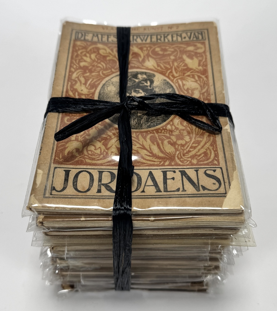 Kavel van achttien antieke kunstboekjes uit de serie "De Meesterwerken van" en "The Masterpieces of". De uitgaven dateren uit het begin van de twintigste eeuw en behandelen diverse beroemde meesters zoals Rubens, Rembrandt, Jordaens en Mauve. De boekjes zijn uitgevoerd met papieren omslagen in Art Nouveau stijl en bevatten zwart-wit reproducties. Een gemengde set van Nederlandse en Engelse edities.