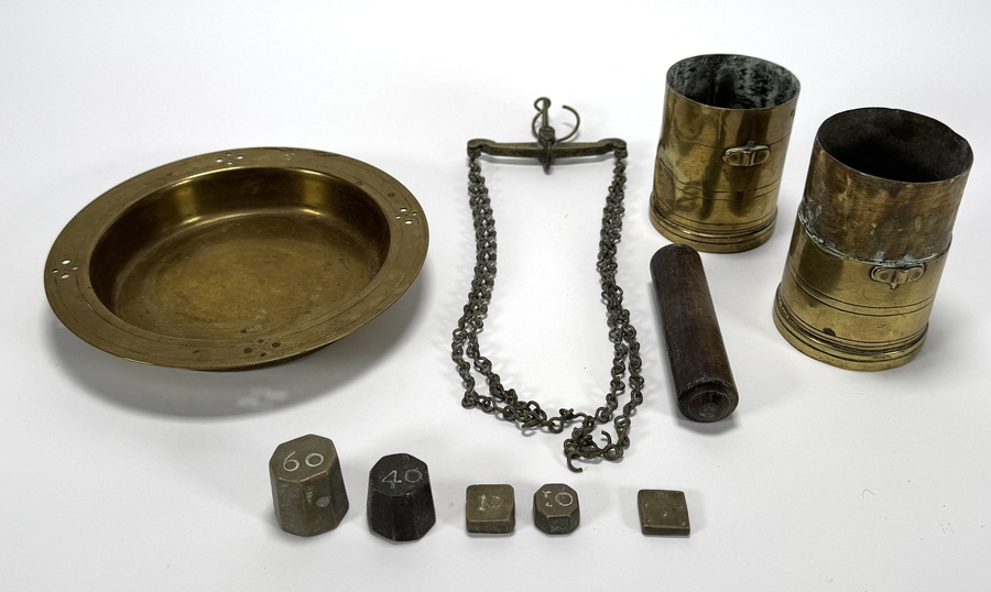 Messing handbalans, gesigneerd door C. Becker, dateert uit de eerste helft van de 19e eeuw. De set omvat een balansarm, kettingen, een ronde schaal en in elkaar passende cilindrische bakjes. voorzien van geslagen ijkmerken (GHS), met diverse losse messing gewichten.