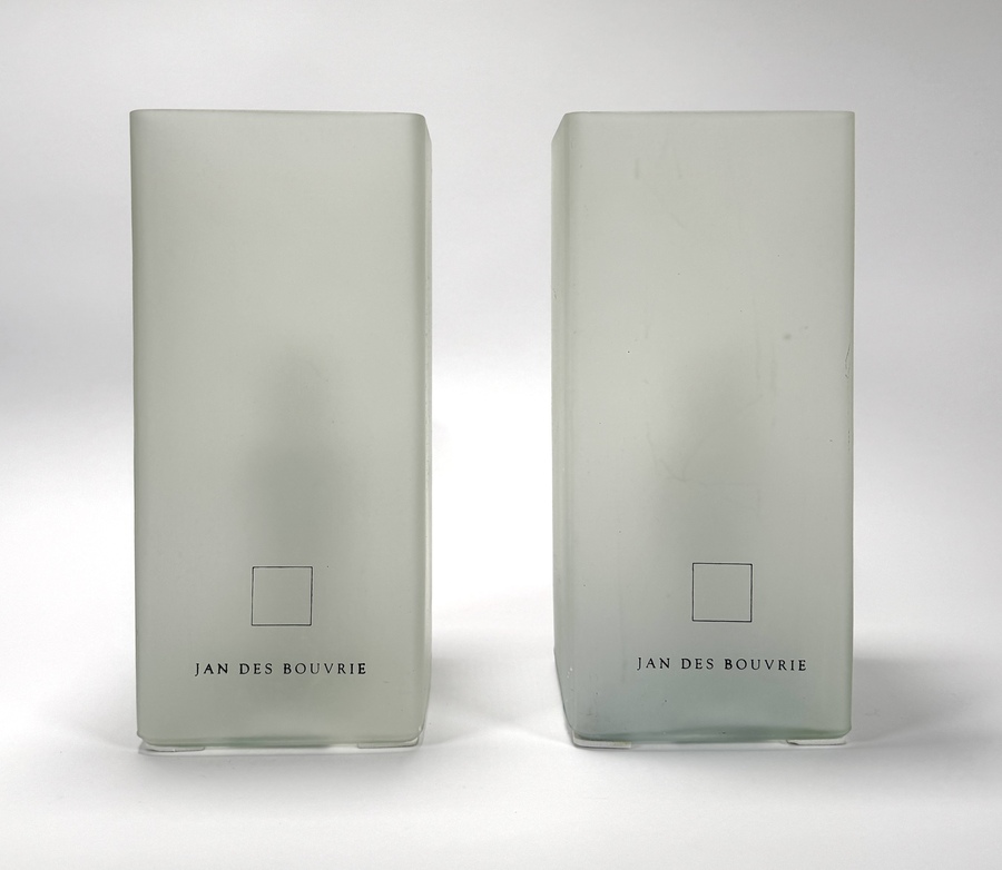 Set van twee tafellampen, model 'Ice Cubic Lamp', ontworpen door Jan des Bouvrie voor Boxford Holland. De lampen dateren uit eind 20e eeuw en zijn uitgevoerd in dik, gematteerd glas met een strakke, rechthoekige vormgeving.