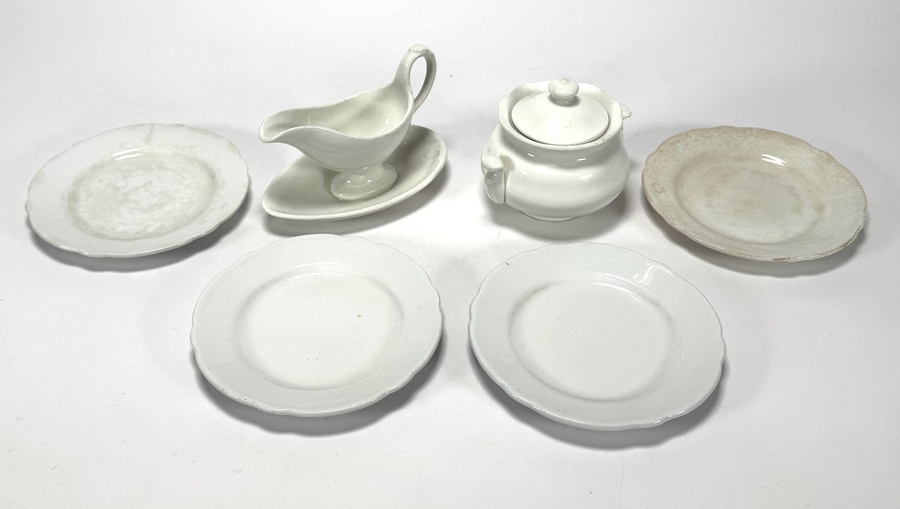 Zs serviesdelen van Petrus Regout & Co. uit Maastricht, daterend uit het einde van de 19e eeuw, bestaande uit een sauskom, een kleine terrine met deksel en vier bordjes, uitgevoerd in wit geglazuurd aardewerk. De voorwerpen zijn aan de onderzijde gemerkt met de kenmerkende Sphinx-stempels.