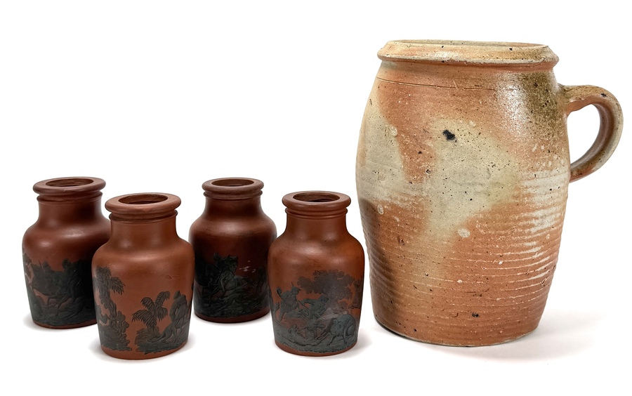 Lot aardewerk bestaande uit vier Engelse prattware potten en één zoutgeglazuurde steengoed kan, allen uit de tweede helft 19e eeuw. De potten zijn van roodbruin aardewerk met donkere transferdruk van een jachtscène met wilde zwijnen, typerend voor Prattware rond 1856. De kan is een tweekleurige steengoed kruik met oor van Duitse herkomst.