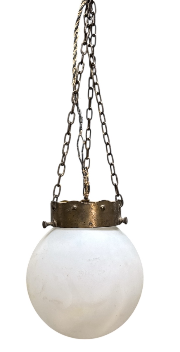 Antieke hanglamp uitgevoerd in neoklassieke stijl met Art Nouveau invloeden, begin 20e eeuw. De lamp bestaat uit een bol van wit melkglas, gevat in een messing montuur, hangend aan drie kettingen die samenkomen bij een plafondkap.
