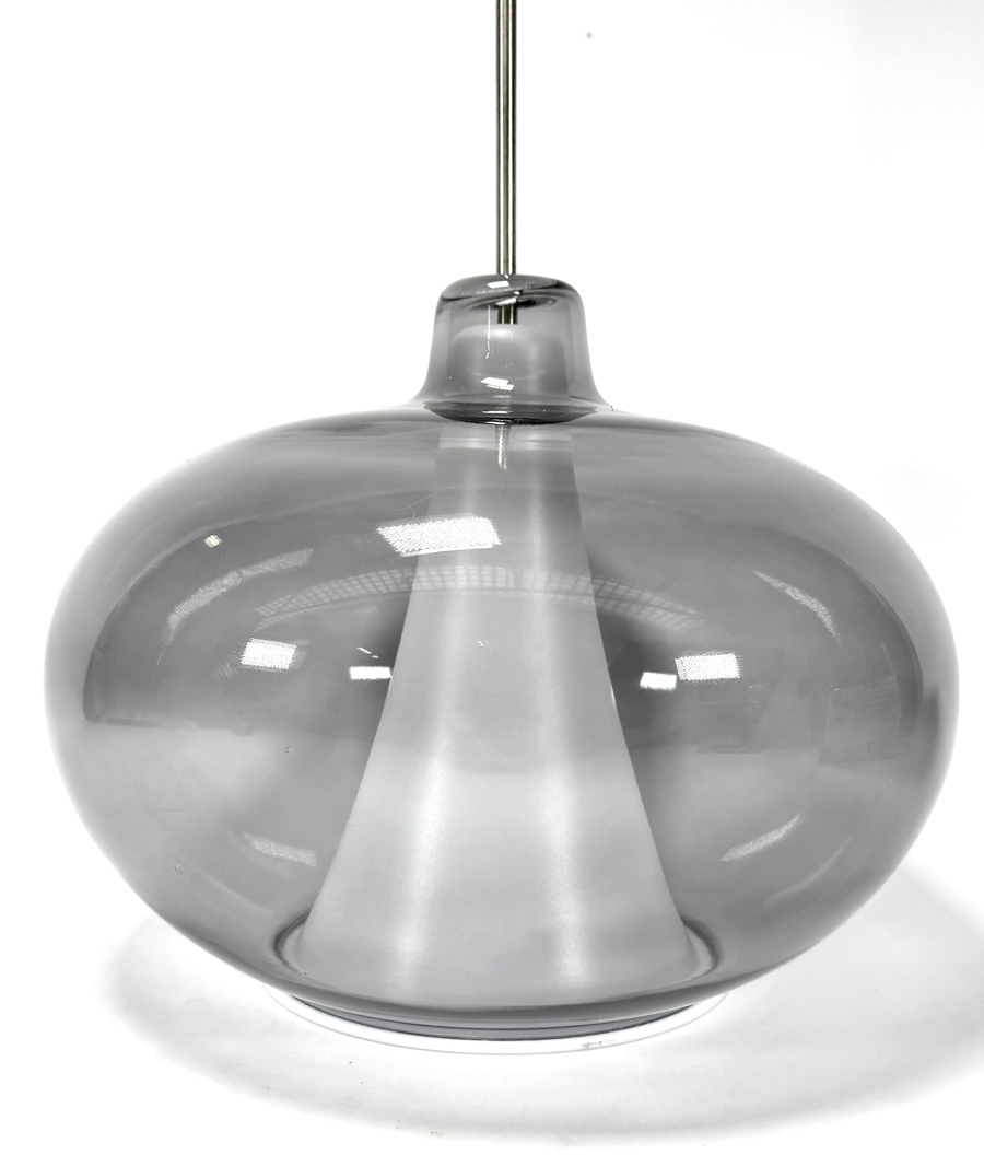 Philips hanglamp uitgevoerd in een modernistische stijl met Space Age kenmerken. De lamp dateert uit circa 1975 en bestaat uit een ellipsvormige kap van rookglas met een conische, witte glazen binnen kern. De constructie wordt gedragen door een verchroomde metalen stang.