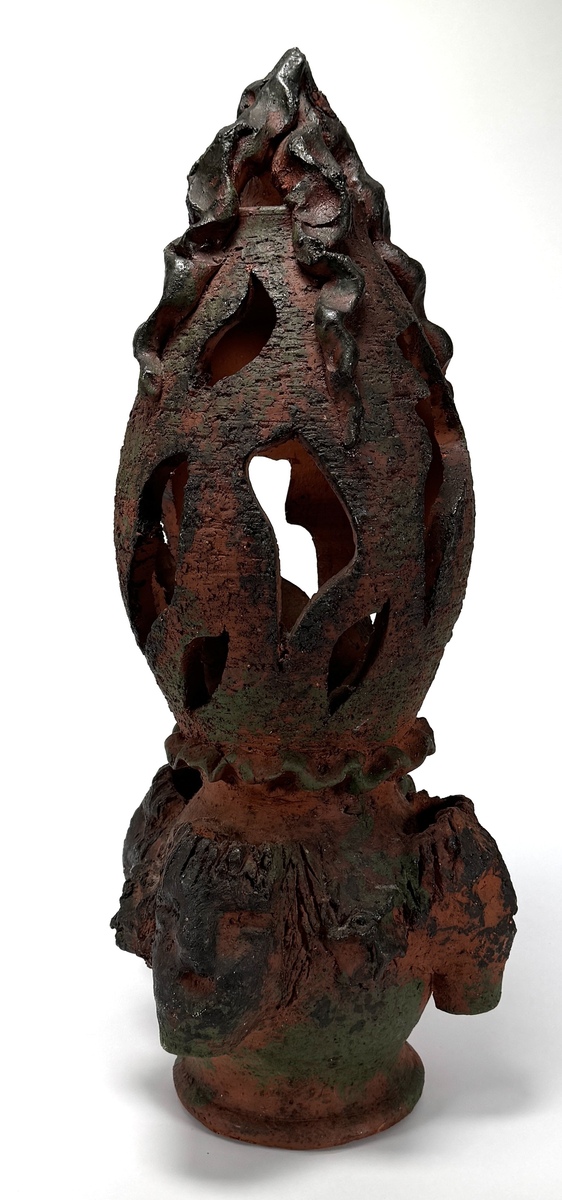 Brutalistische tafellamp, vervaardigd uit ruw chamotte aardewerk in terracotta en zwart, daterend uit de jaren 1970. De lampvoet toont een organische, torenvormige beeld met uitgesneden openingen en is aan de basis gedecoreerd met gestileerde gezichten in reliëf.