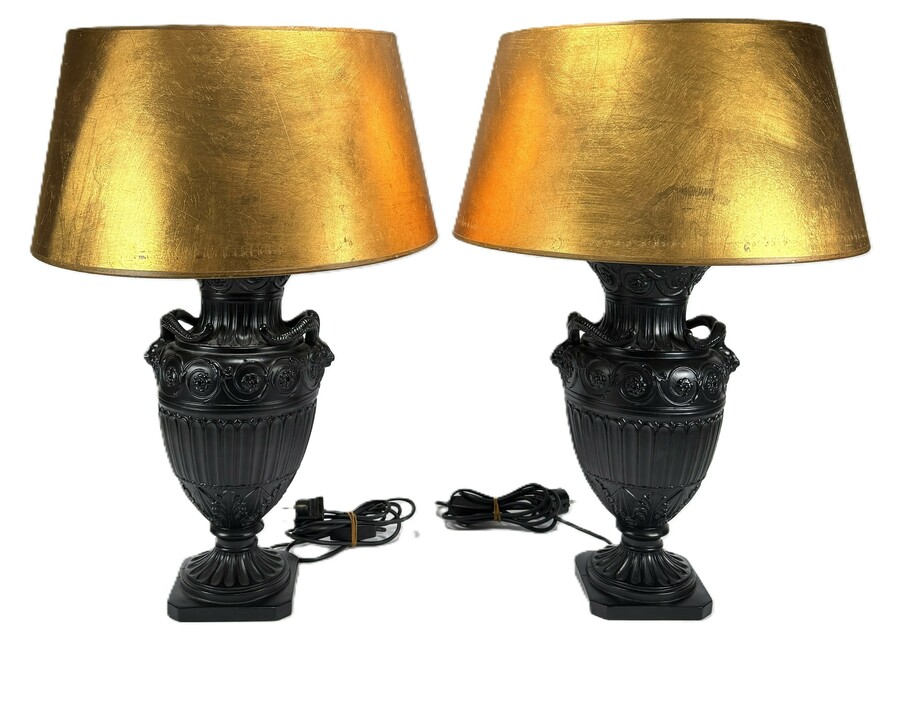 Twee tafellampen, uitgevoerd in neoclassicistische stijl met Empire invloeden, tweede helft van de 20e eeuw. De lampen hebben een basis van zwart afgewerkt composiet, gedecoreerd met ramskoppen en guirlandes in reliëf, voorzien van goudkleurige kappen.