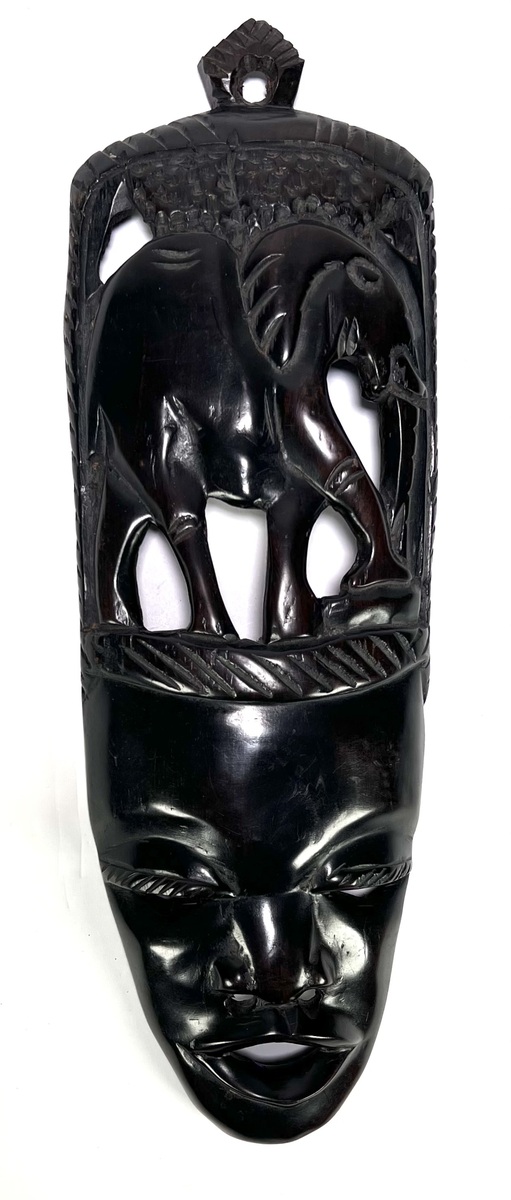 Handgestoken houten wandmasker, vervaardigd uit donker gepolijst tropisch hardhout in een traditionele Afrikaanse stijl. Het masker toont onderaan een gestileerd menselijk gelaat met daarboven een figuratieve voorstelling van een olifant in opengewerkt reliëf. Afrika, tweede helft van de twintigste eeuw.