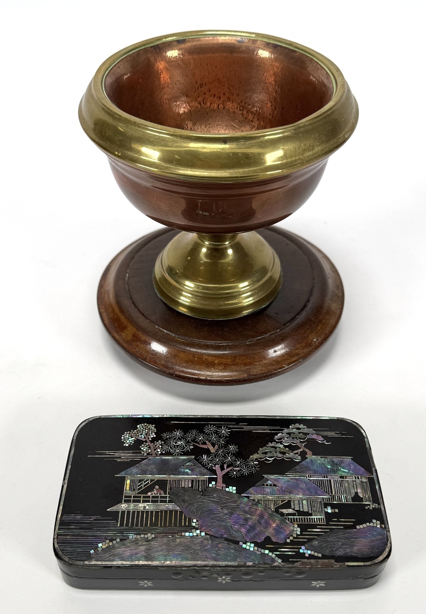 Een gehamerd koperen pijpkomfoor op een gedraaide houten voet en een zwart lakwerk doosje met