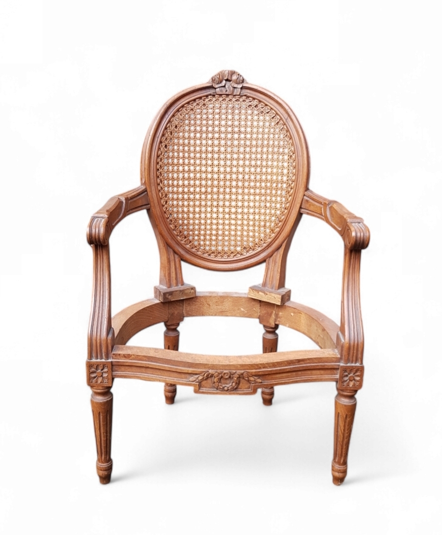 Houten Lodewijk XVI kinderstoel, vervaardigd in de eerste helft van de twintigste eeuw. Het meubel kenmerkt zich door een medaillonrugleuning met vlechtwerk van rotan, gecanneleerde taps toelopende poten en verfijnd houtsnijwerk met rozetten en florale motieven op de regel.