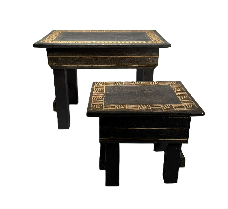 Set van twee houten bijzettafeltjes uit Ethiopië, uit de Jimma regio. Uitgevoerd in donker hardhout met kenmerkend geometrisch kerfsnijwerk, ingelegd met contrasterend wit pigment. Deze Oost-Afrikaanse meubels dateren uit de tweede helft van de 20e eeuw. De constructie is robuust met rechthoekige bladen en rechte poten, typisch voor traditioneel Oromo huisraad.