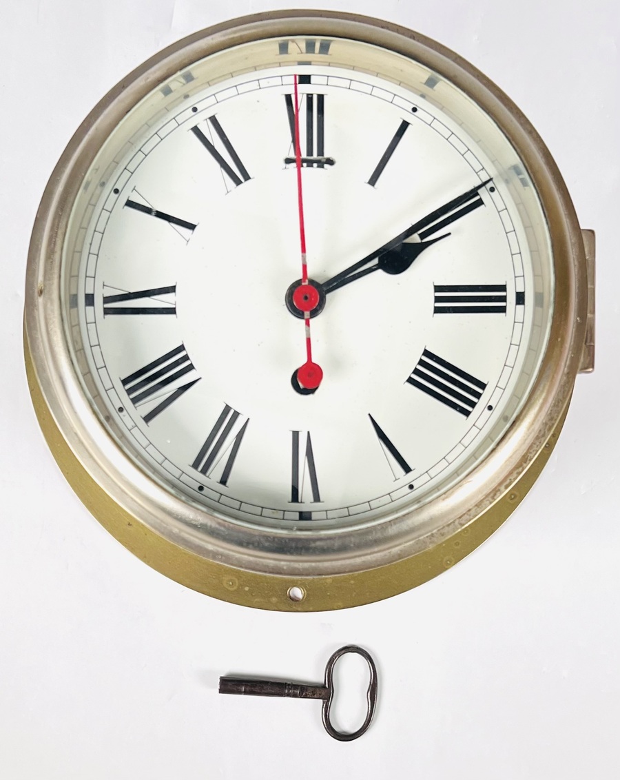 Mechanische scheepsklok in nautische stijl, vervaardigd uit gedraaid messing en glas, daterend uit de periode circa 1900–1930. De klok heeft een witte wijzerplaat met zwarte Romeinse cijfers en rode secondewijzer. Kenmerkend is de robuuste behuizing met montageflens, een opwindsleutel is bijgevoegd. De klok is van Europese herkomst.