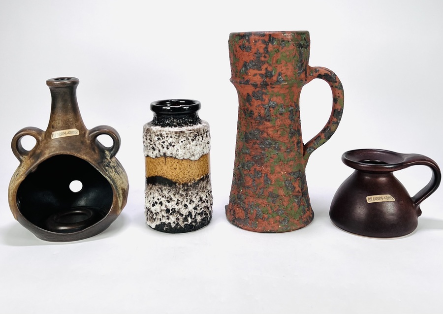 Een vaas, windlicht en twee kannen uit de Mid-century modern periode, daterend midden 20 eeuw. Het lot bevat onder andere een West-Duitse Fat Lava vaas, een schenkkan van Carstens Atelier en een schenkkan van Potterie Steenenkop Handwerk. Alle objecten zijn vervaardigd van aardewerk door middel van draaien en glazuren.