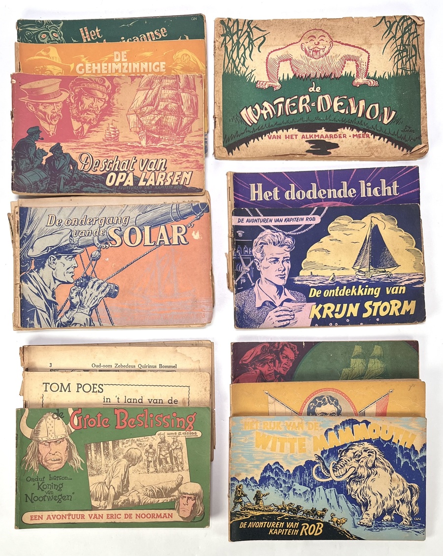 Lot met diverse Nederlandstalige stripboekjes en publicaties uit de midden 20e eeuw, vervaardigd door middel van offsetdruk op papier. De publicaties omvatten reeksen als Tom Poes door Marten Toonder, Kapitein Rob door P. J. Kuhn en Eric de Noorman door Hans Kresse. De thematiek is avontuur, fantasie en historie met kenmerkende naoorlogse illustratiestijl op de omslagen.