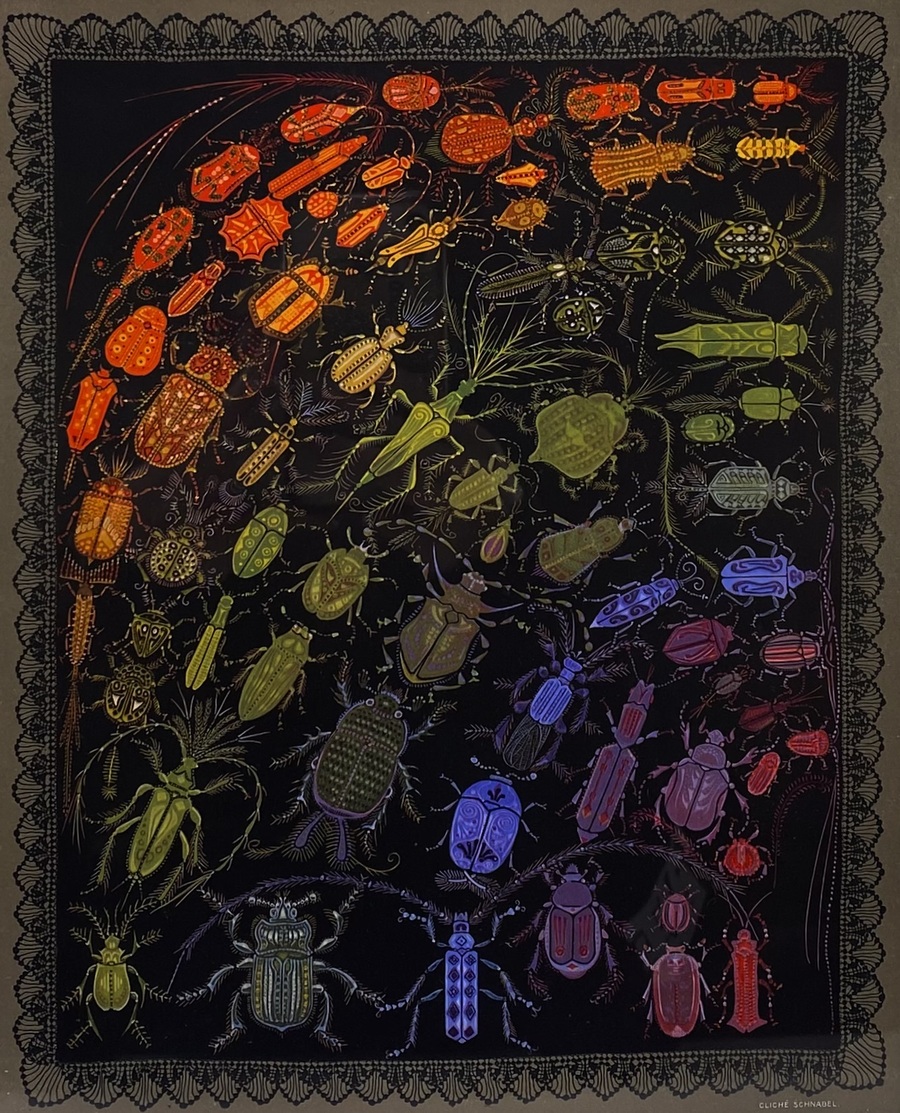 Lithografie op papier door Anton van der Valk (1884–1975), bekend onder het pseudoniem Ton van Tast, getiteld “kevers en torren”. Uitgegeven door Cliché Schnabel in 1925. Het werk toont in Art Deco stijl een grafische compositie van insecten in contrasterende kleuren, voorzien van druksignatuur.