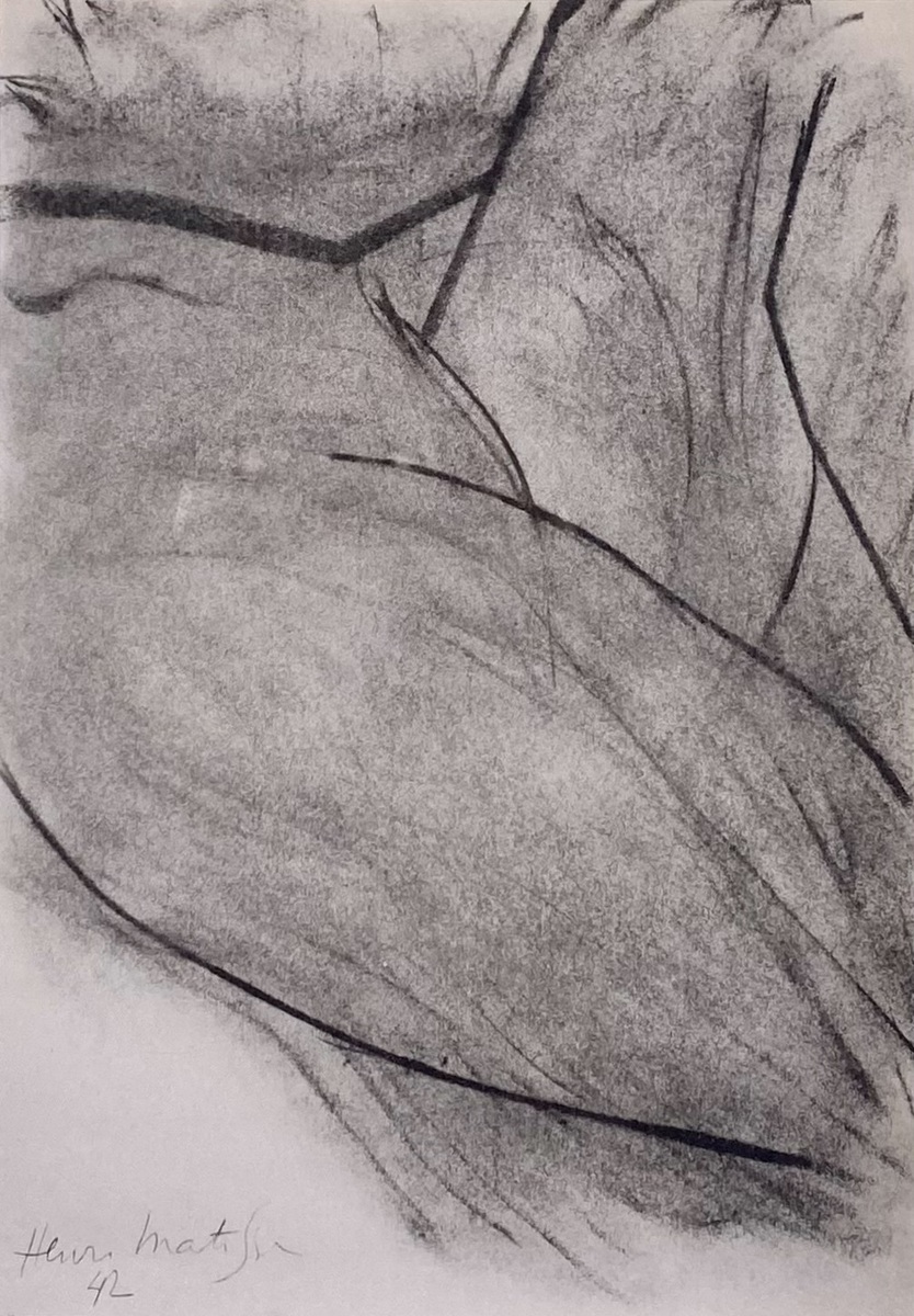 Heliogravure naar Henri Matisse (1869–1954) van een naaktstudie in houtskool uit 1942, met de signatuur in de plaat. Het werk, gedrukt in 1973 door Forum Verlag Wien, toont een expressieve, abstracte figuurstudie. De diepdruktechniek reproduceert de tonale arceringen en de brede dynamische lijnen van de oorspronkelijke tekening getrouw, wat kenmerkend is voor Matisse.