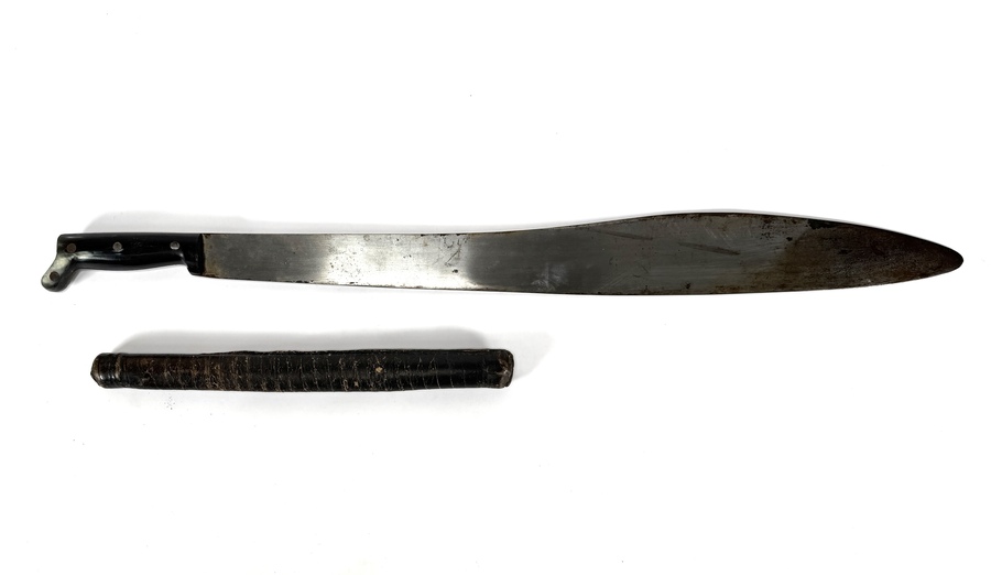 Kapmes met licht gebogen stalen lemmet en zwart handvat met gekromd hoornstuk en klinknagelbevestiging, vergezeld van leren knuppel. Het kapmes heeft rechte rug en verbrede punt, gesigneerd met initialen "G W H" en serienummer "Nº 843" op de kling. Vervaardigd in Zuidoost-Azië, eerste helft 20e eeuw. Het object combineert industriële met handmatige productie en vertoont sporen van praktisch gebruik.