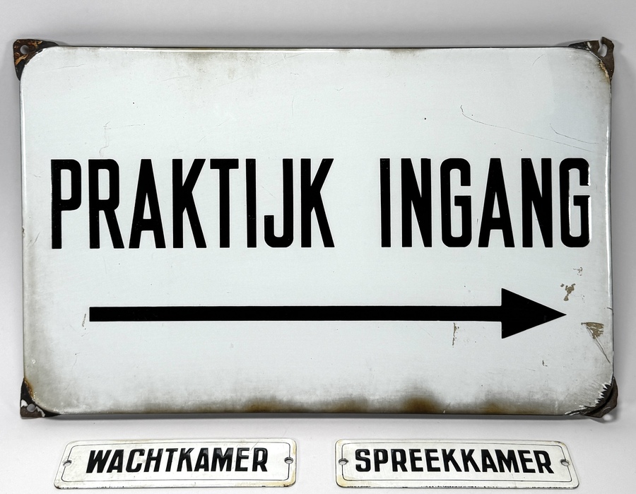 Drie emaille borden uit een Nederlandse medische praktijk, daterend uit het midden van de 20e eeuw; een gevelbord met de tekst 'PRAKTIJK INGANG' en een richtingspijl, plus twee bijpassende deurbordjes met 'WACHTKAMER' en 'SPREEKKAMER'.