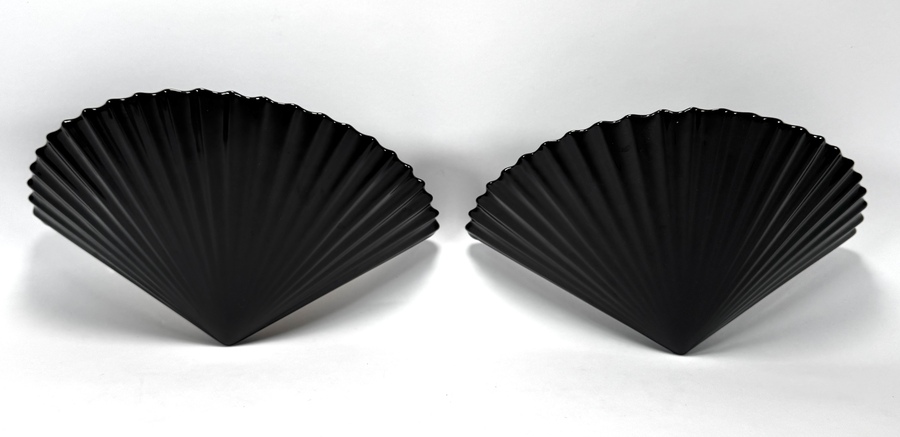 Postmoderne wandlampen van gegoten keramiek, daterend uit de periode circa 1985–1995, uitgevoerd met een hoogglans zwart glazuur. De lampen hebben een sculpturale vorm van een geplisseerde schelp en bevatten een interne fitting voor wandmontage, achterzijde van het object is wit geglazuurd.