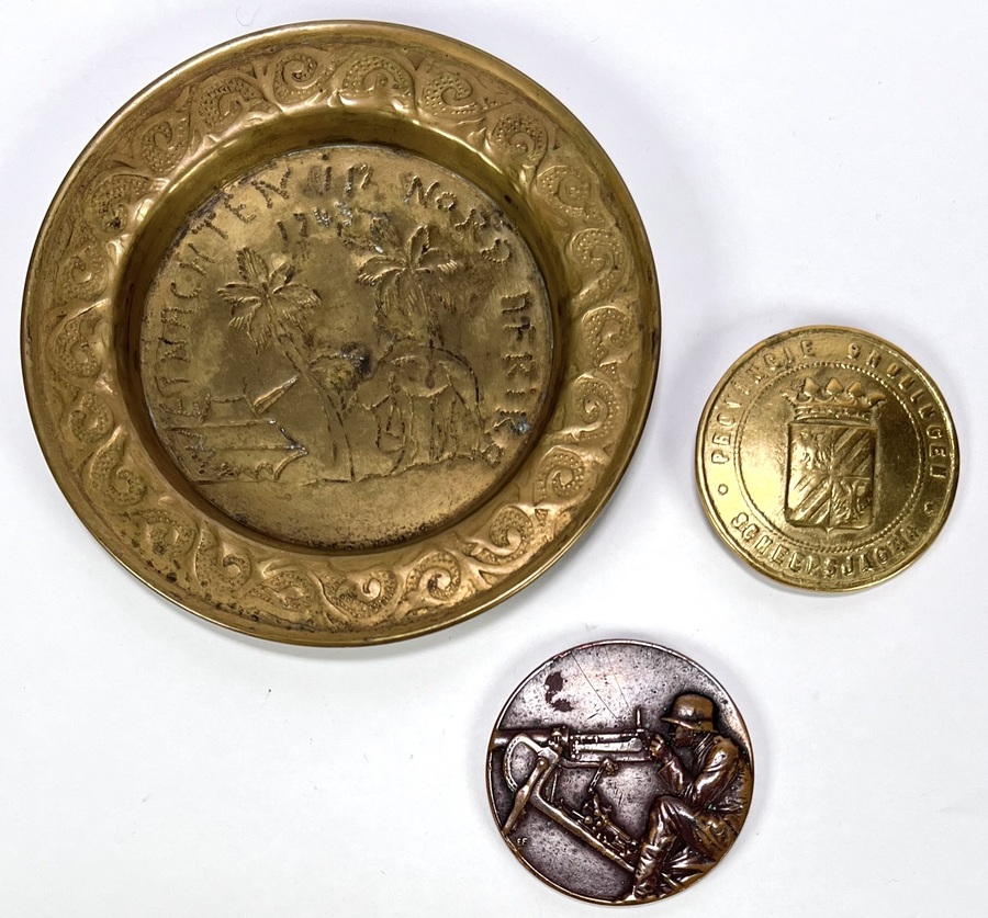 Medaille, schaaltje en een plaquette, daterend uit de eerste helft 20e eeuw. Het lot omvat een bronzen militaire plaquette, gedateerd 1929, met Duitstalige inscriptie over een schietwedstrijd en een machinegeweerschutter, een messing souvenirschaaltje ("WEIHNACHTEN IN NORD-AFRIK") en een heraldische medaille van de Odenweg Schuelerbund.