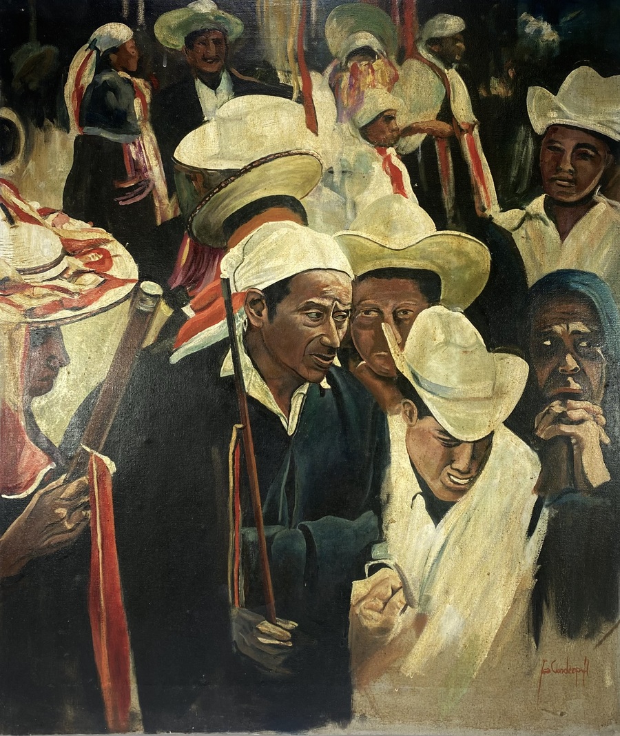 Schilderij in een expressief sociaal realistische stijl, eerste helft 20e eeuw, olieverf op doek. De voorstelling is een dichte groepscompositie van figuren met hoeden en stokken, kenmerkend voor scènes uit de Latijns-Amerikaanse Indigenismo kunststroming. Het werk maakt gebruik van een donker palet met felle contrasten in de kleding. Het is onduidelijk gesigneerd rechtsonder.
