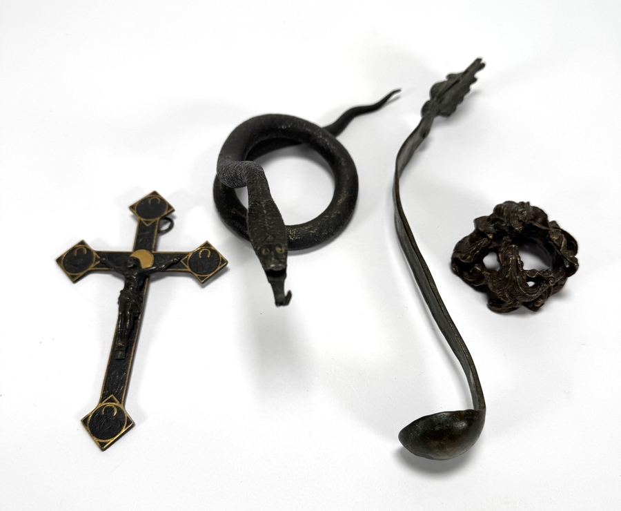 Vier metalen objecten, vervaardigd door gieten, daterend van de late 19e tot de midden 20e eeuw. Het lot omvat een neogotisch messing crucifix met reliëffiguren, een bronzen beeld, een figuurlijke slang en een messing langoorlepel met gestileerde vogelkop.