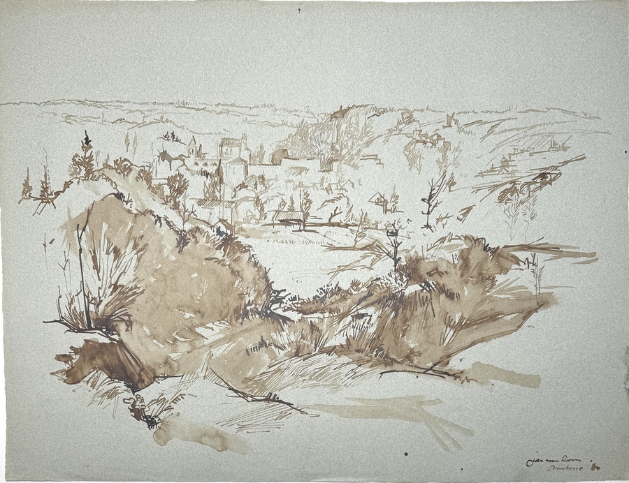 Tekening door Jan van Loon (1938), uitgevoerd in pen en inkt op papier, gecombineerd met lavis. De tekening toont een landschap in impressionistische stijl met heuvels en een dorp op de achtergrond. Het werk is gesigneerd "Jan van Loon" met de locatie "Ambrone" en gedateerd '64 rechtsonder.