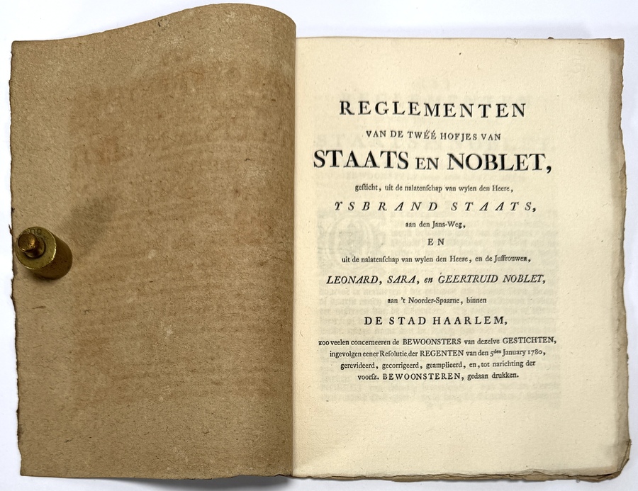 Gedrukte cahier bevat de reglementen van het Hofje van Staats en het Hofje van Noblet, daterend uit 1780, een historische juridische publicatie van papier, gedrukt door een drukker in Haarlem. De tekst beschrijft de regels voor de bewoners van de door IJsbrand Staats en de familie Noblet gestichte hofjes.