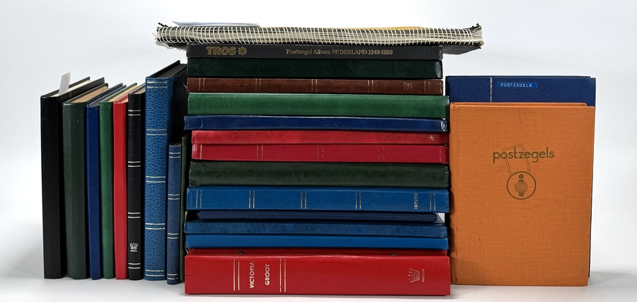Postzegelalbums en losse postzegels, vervaardigd door diverse uitgevers (Impuls, Tiros, Victoria) en posterijen. De wereldcollectie uit de laat 19e tot midden 20e eeuw bevat gestempelde en ongestempelde zegels uit onder meer Nederland (Wilhelmina, Vliegende Duif) en voormalige Britse Koloniën (Fiji, Australië), alsook andere Afrikaanse koloniën. De zegels zijn vervaardigd door diepdruk en lithografie in klassieke stijl.