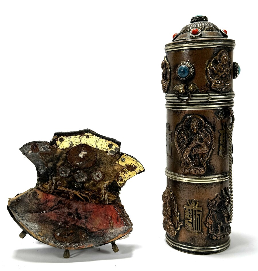 Tibetaanse rituele objecten bestaande uit een metalen amuletbuidel (ga'u) met leren draagband en een cilindrische houder. Beide objecten zijn vervaardigd uit koperlegering door middel van drijven en inlegwerk, gedateerd circa 1900–1940. Ze zijn gedecoreerd met reliëfvoorstellingen van Boeddhistische godheden en mantra-tekens, ingelegd met turquoise en koraal.