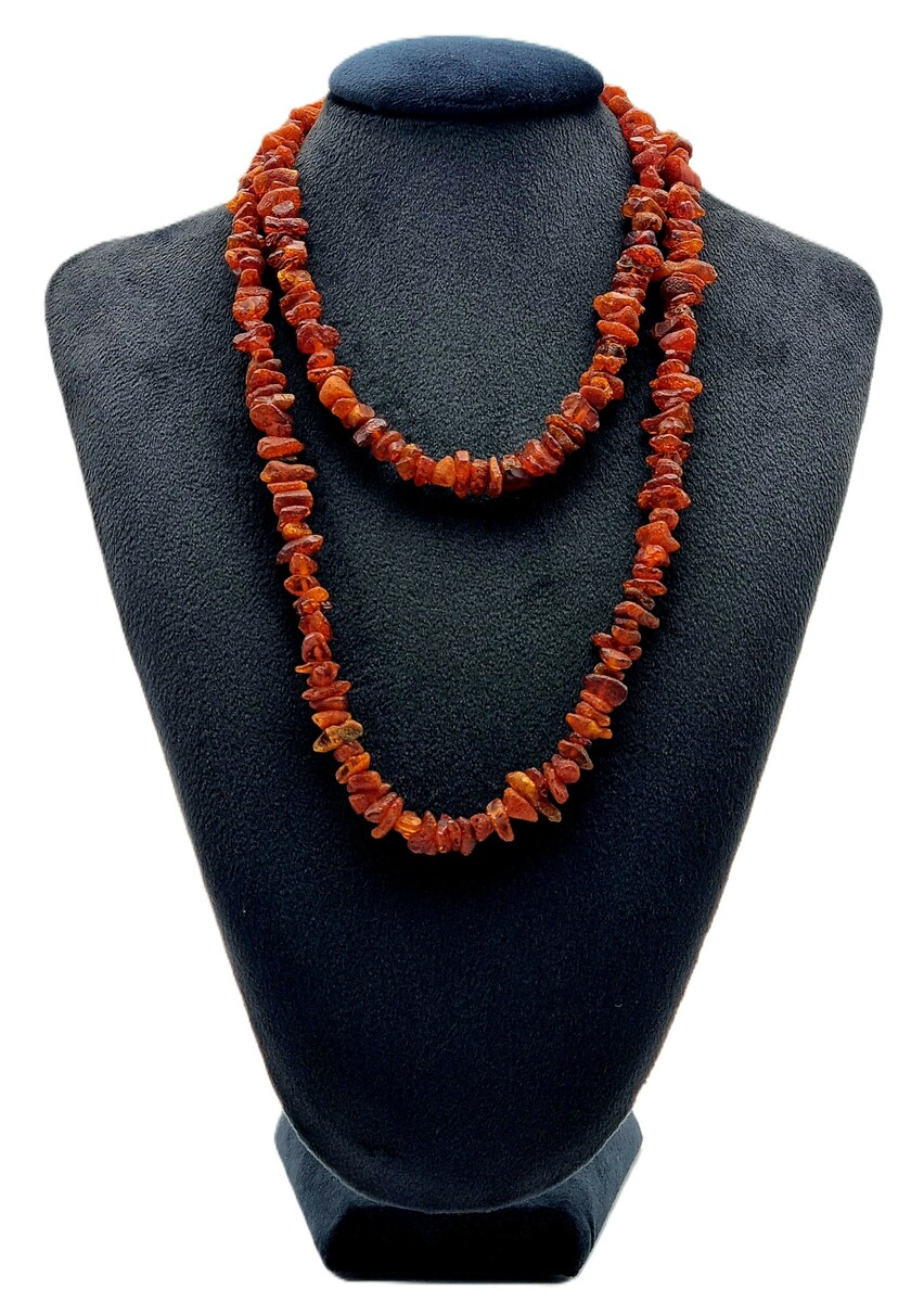 Lange halsketting in de naturalistische stijl, vervaardigd uit talloze roodbruine barnsteenfragmenten. De ketting is afkomstig uit de Baltische regio, gedateerd midden 20e eeuw. De onregelmatig gevormde fragmenten zijn geregen en vertonen de diepe roodbruine kleur.