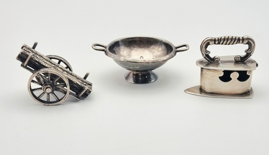 1509. Sterling zilveren miniaturen – kar, strijkijzer en vergiet, 1920–1950
