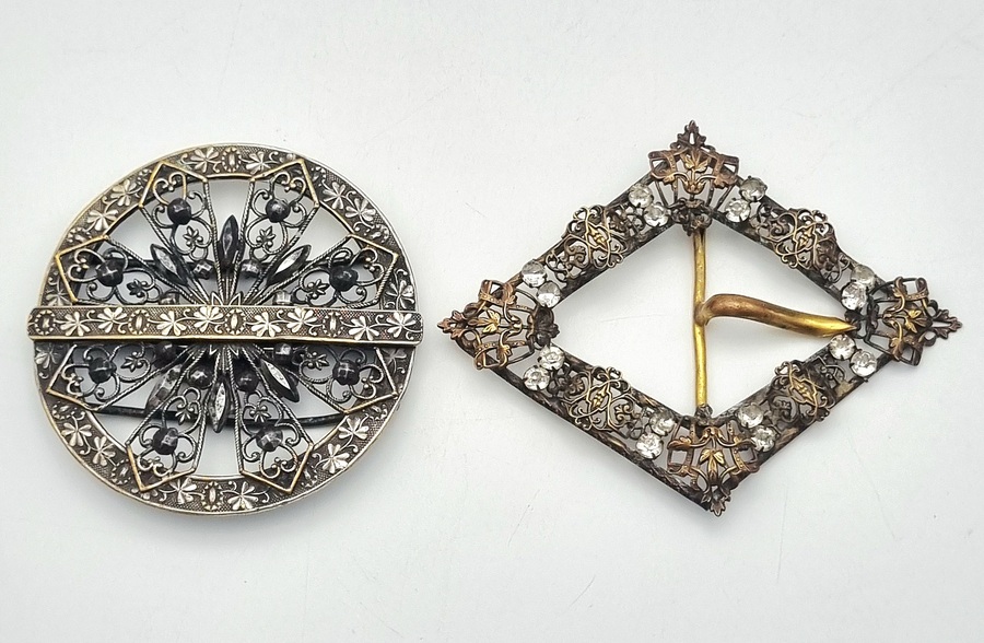 Twee antieke kledinggespen in de neorococo stijl, vervaardigd uit verzilverde en messing basismetaallegeringen middels giet- en filigraantechniek. De gespen dateren ca. 1880–1910 en zijn rijkelijk gezet met facetgeslepen glassteentjes (strass) en florale ornamenten. De set bestaat uit een tweedelige ronde gesp met stermotief en een ruitvormige gesp met een traditionele messing doorn. Herkomst Centraal-Europa.